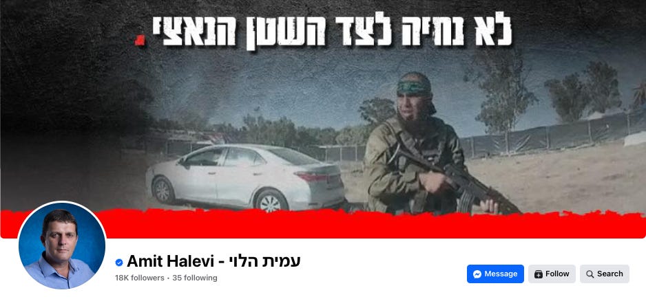 From Halevi’s point of view, having Israel fully control Gaza is the only way to eradicate Hamas, and eradicating Hamas is the only way to ensure that we can live here. To return to the image at the top of his FB page, “We will not live next to the Nazi Satan.”