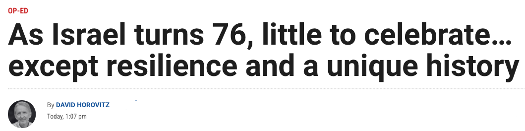 That national TV would actually take time to show the unofficial ceremony even as the national one was still unfolding spoke volumes about where this country’s heart was (or wasn’t) on Independence Day. David Horovitz, founding editor of the Times of Israel, summed it up with his OpEd: