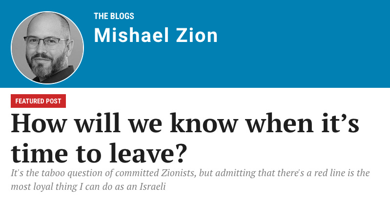 One thing I find both fascinating and terrifying is that my husband and I have the same conversations in the US about when will it be time to leave, should we move money, etc. as Mishael Zion has with his wife about leaving Israel. The difference is that my husband and I have these conversations because we feel unsafe. The Zions seem more concerned about whether of Israel continues to reflect their moral vision for the Jewish state which as far as I am concerned. Is a luxury.