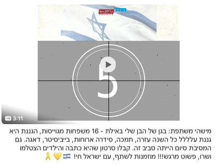 “Someone shared this: In my son’s kindergarten in Eilat, a class that has sixteen kids from families with soldiers called up, the teacher is simply amazing. All year, she’s been helping, supporting, setting up meals, babysitting, worrying about us. Even the end of the year party was like that. Here’s the video that she wrote and that the children sang and recorded, really moving. You’re more than welcome to share this. Am Yisrael Chai! 🇸🇻💛🎗️”