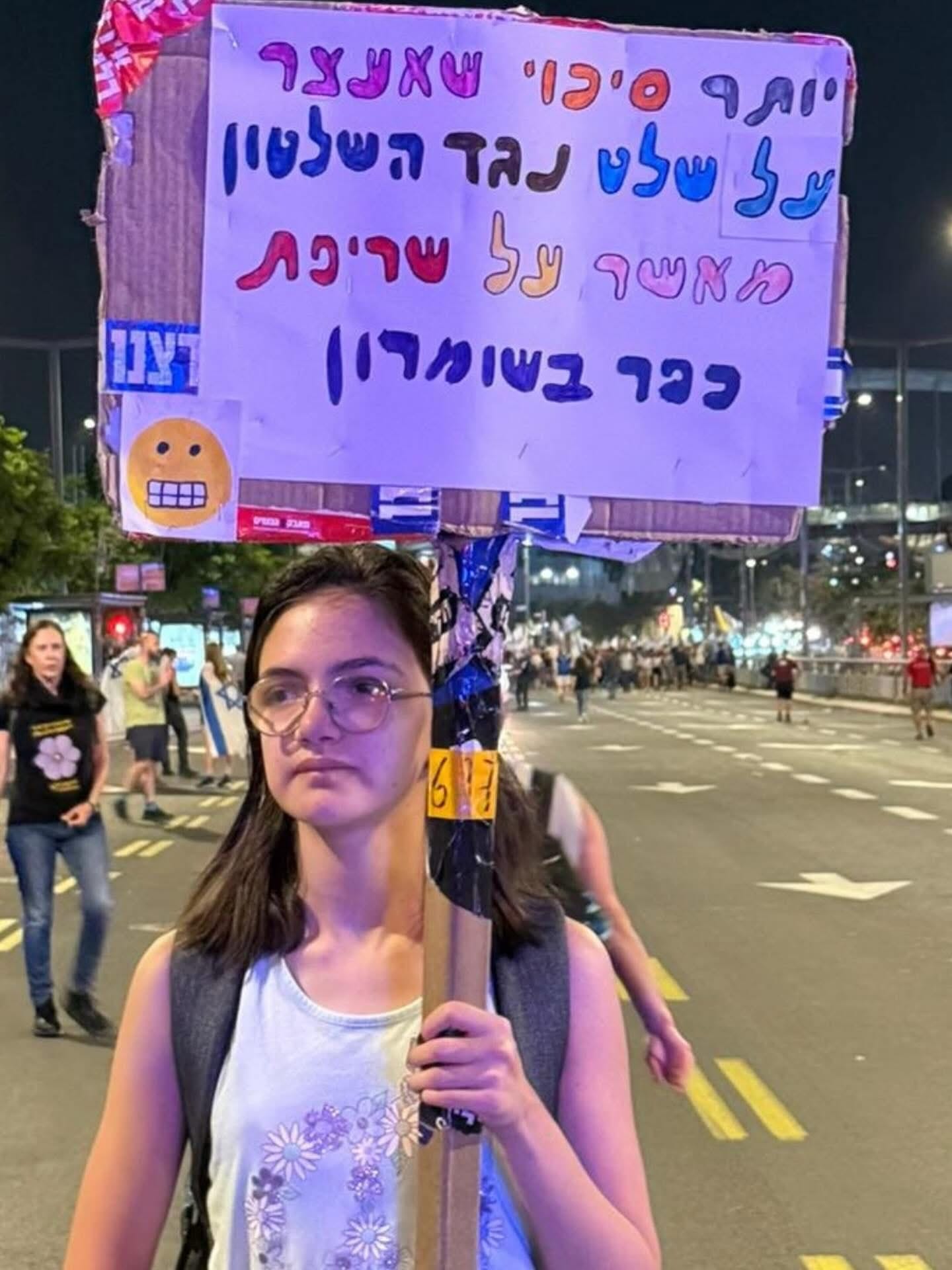 Far from the hallowed halls of the Knesset, out in the street on Saturday night at the Tel Aviv protest, a protester held up a sign that in its own way, mirrored what MK Shir had said. The sign reads: