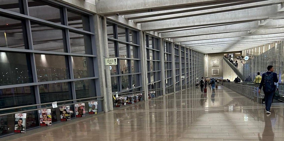 When we’d left Israel a few weeks earlier, it was still lined with hostage posters on both sides of the walkway, in both directions, the one for people arriving and the one for passengers departing. When our son-in-law flew home from a work trip a few days before we returned, he took this shot of a few posters remaining.