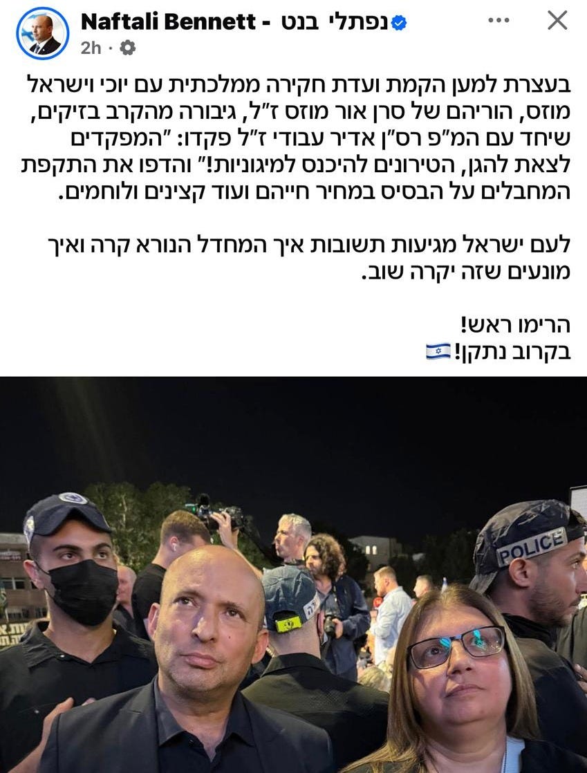 After that very same protest in Tel Aviv (which is now referred to as a protest for a National Commission of Inquiry rather than on behalf of the hostages, almost all of whom are back), Naftali Bennett, whose campaign is now well under way, posted this: