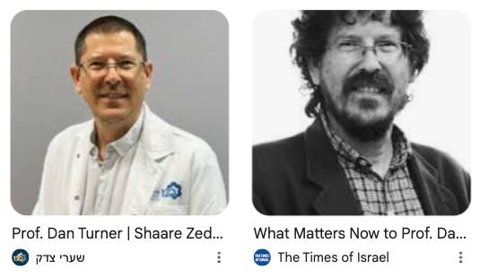 To me, those two photos represent the best of Israel — professional/medical/scientific excellence, combined with moral passion and courage. For the two years of the war, for reasons he will explain in our podcast conversation tomorrow (a conversation which deeply moved me), Professor Turner didn’t cut his hair much and let his beard grow. I suspect our listeners will find him riveting as well.