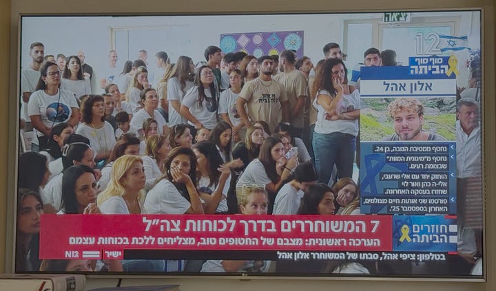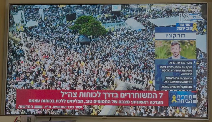 Gatherings in the home of the hostages, a massive rally at Hostage Square. When I turned on the TV at 3:00 a.m., there were already hundreds of them there … some hours later, estimates were of close to 100,000 people who wanted to witness the events on giant screens at the place that became synonymous with the public’s drive to get the hostages home.