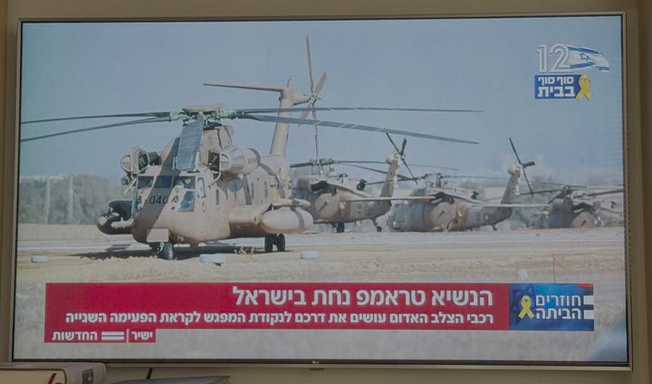 Newscasters couldn’t help but point to ironies throughout the long hours. They noted multiple photos of planes, for example; the helicopters waiting to take the released hostages to three hospitals, while Air Force One made an unscheduled swoop over the beach of Tel Aviv, so Israelis could see the plane and so that the President could see the enormous sign thanking him laid out next to the water.