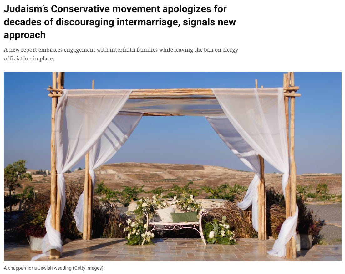 I’ll confess to having been stunned by the story. Not that the Conservative movement embracing intermarriage would be a surprise—some leading Conservative rabbis having been push in that direction for quite some time, and with the numbers of Conservative congregations and members both tanking precipitously, the movement is in a tough spot.