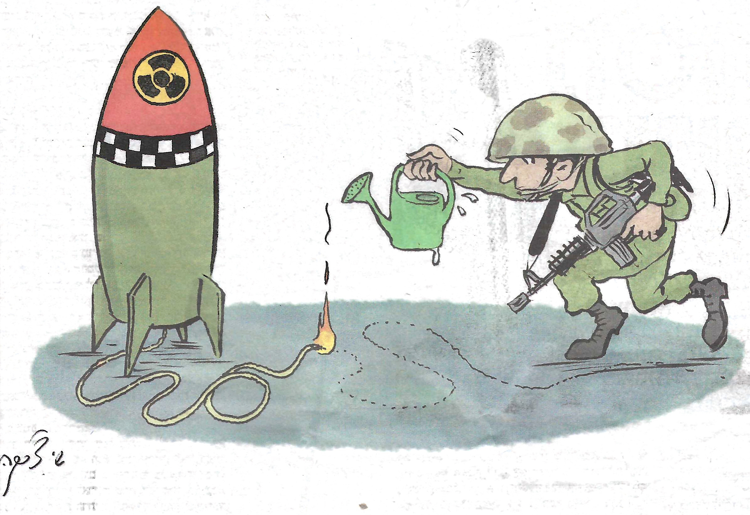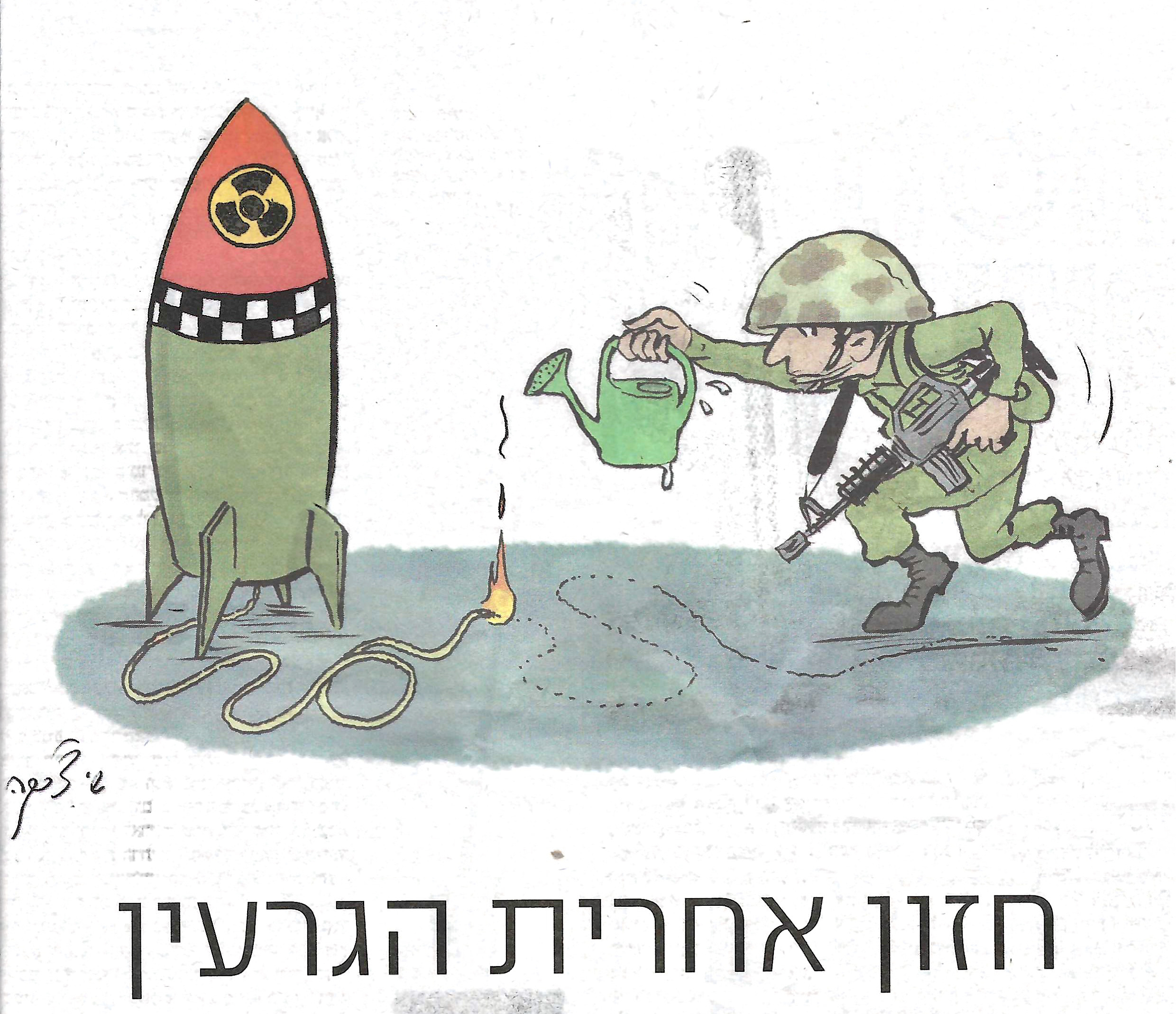 That headline and the cartoon accompanying it in Makor Rishon are portrayed above. Look at the cartoon carefully. A fairly pathetic Israeli soldier, not looking terribly optimistic, is using a garden watering-can to stop the fuse to a nuclear bomb. Note, also, that much of the fuse has already been burned.