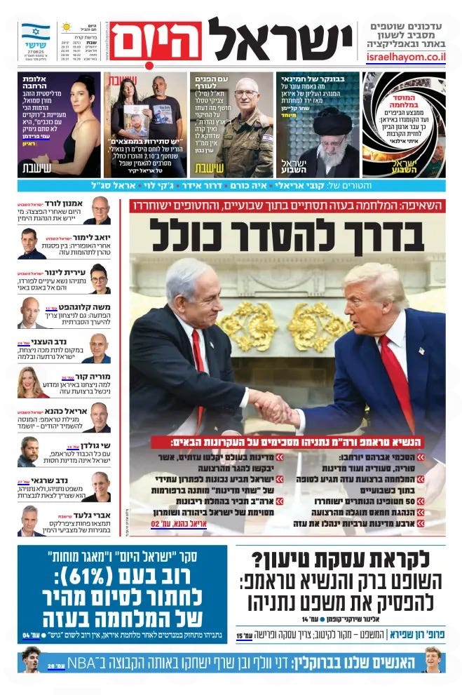 Here’s the front page on which Yisrael Hayom “announced” those elements and others (including the poll—see bottom left in blue) that 61% of Israelis want a rapid end to the war in Gaza).