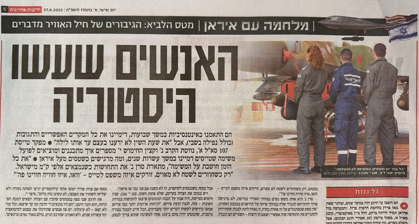To be sure, there’s a deep sense of pride, even awe, at what the Air Force and Mossad accomplished (though there’s now a bit of a public pissing match between the Air Force and Mossad as to who really gets the credit—it can be exhausting to live in a country run by adolescents). Twelve days of relentless pounding of Iran, a country we were deeply fearful of not long ago, and not a single plane lost? Not a single pilot in captivity? Flawless, day after day, night after night, bombing run after bombing run… It’s truly an operation that will be studied around the world, and we—along with the pilots who accomplished it—know that we watched history being made.