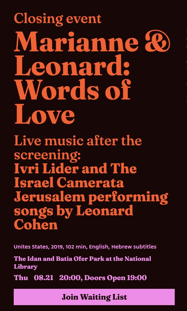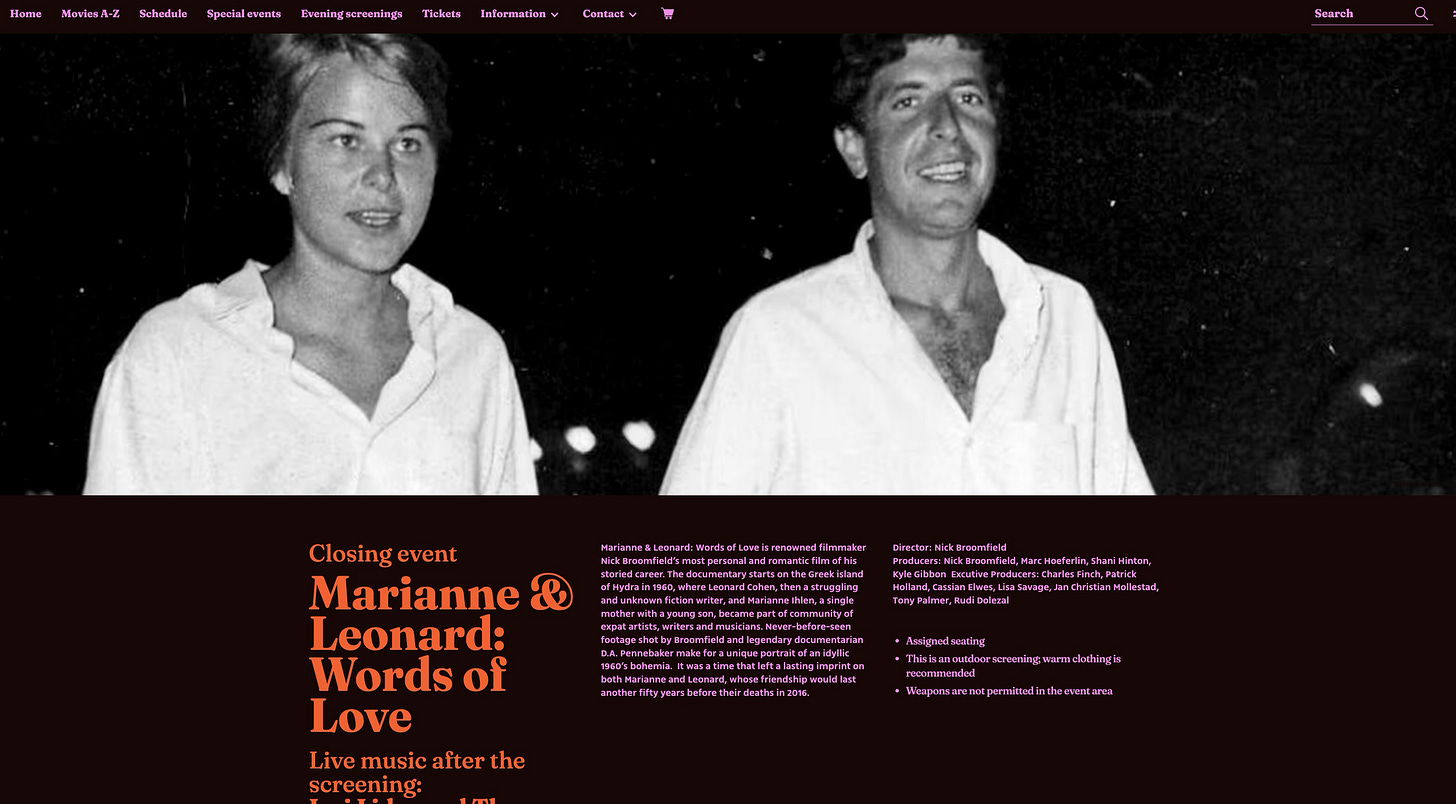 And there was the closing event, a screening of “Leonard and Marianne: Words of Love,” a film about Leonard Cohen and his tortured, famed and much-sung-about relationship with Marianne Ihlen (a beautiful movie worth finding where you can).