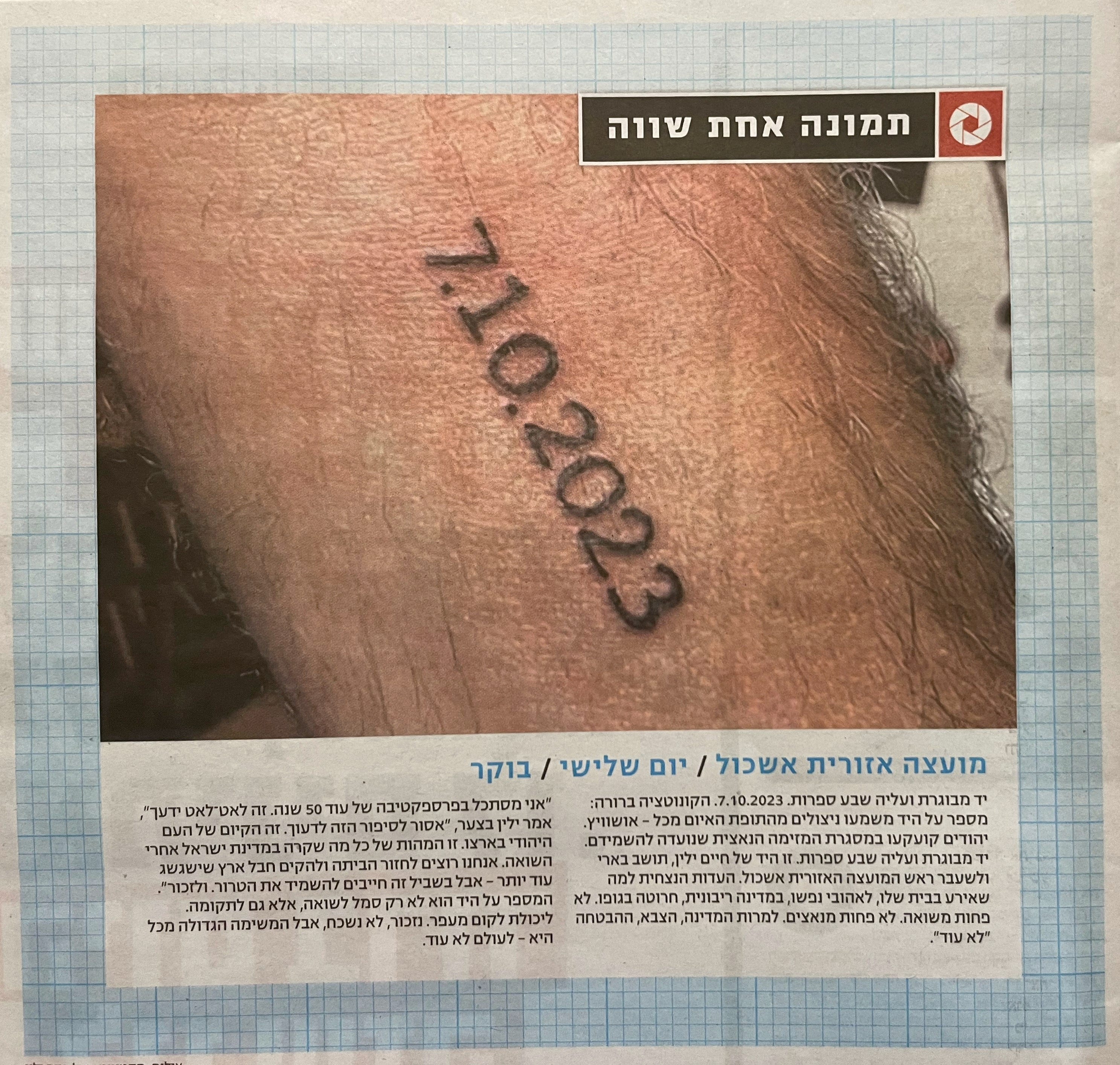 This is the arm of Hayim Yellin, a resident of Kibbutz Be’eri, where one of the massacres took place. He didn’t need to explain to anyone what tattooing the date October 7 on his arm in that way was supposed to represent.