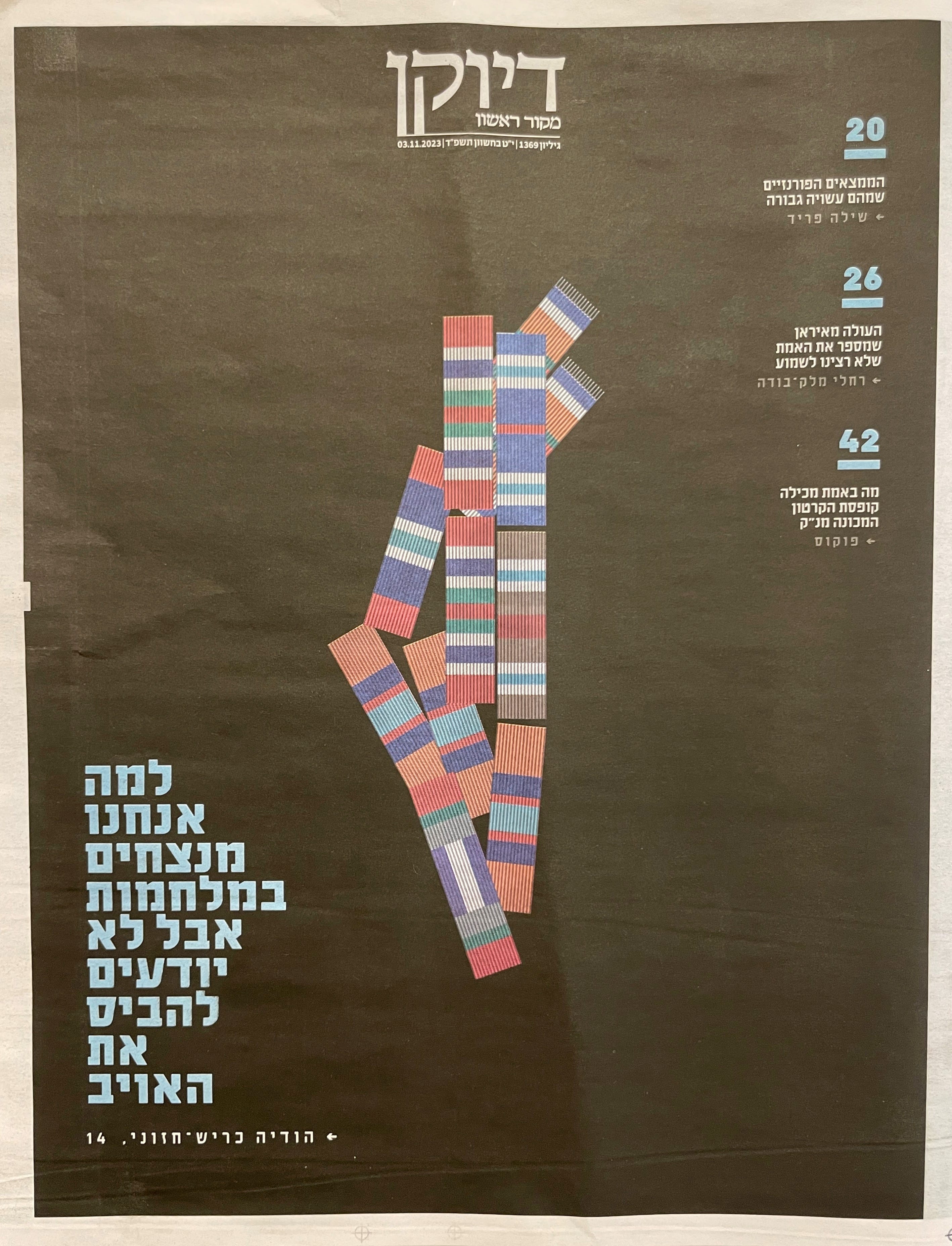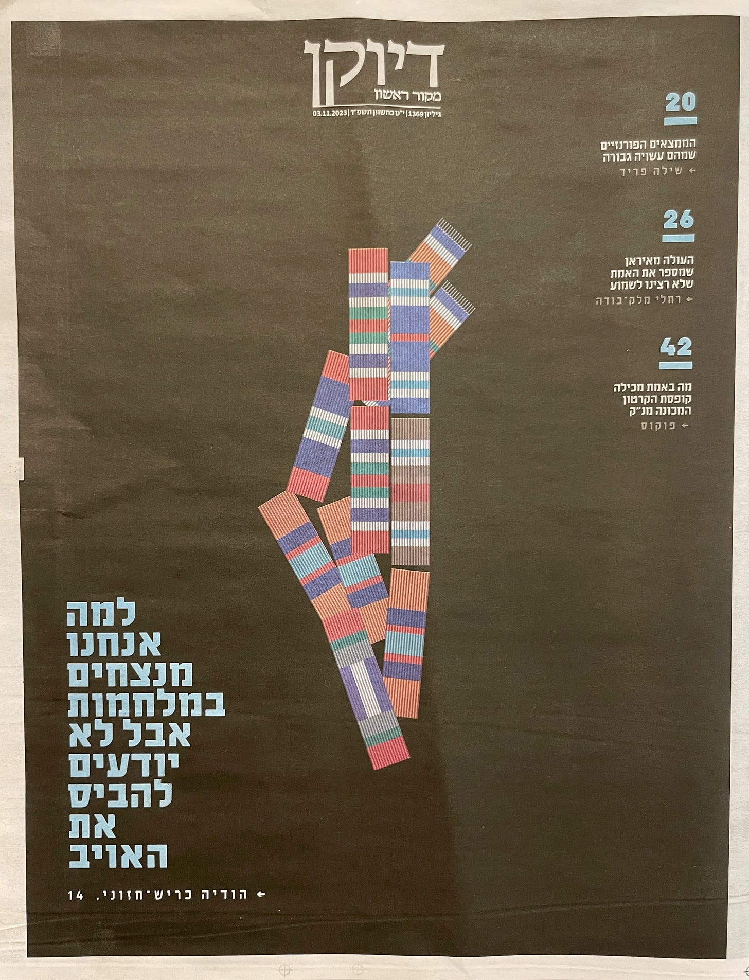 ABOVE: HEADLINE IN LIGHT BLUE FROM THE “PORTRAIT” MAGAZINE SECTION OF MAKOR RISHON (the map is made of military ribbons worn on IDF dress uniforms):