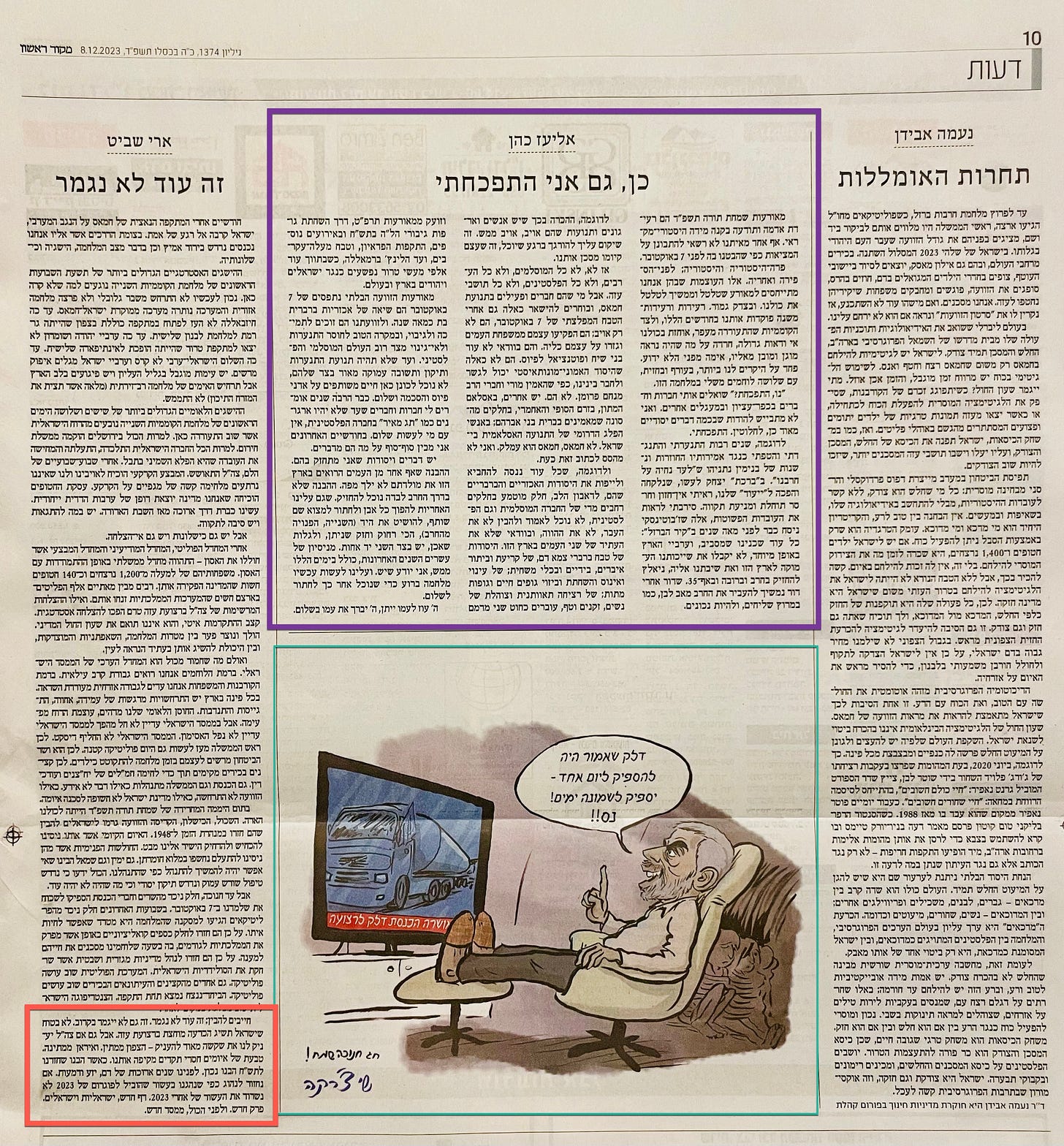 Finally, for today, a column by Eliaz Cohen (in the purple outline above), “I’ve also sobered up.” “Sobering up” is a commonly used phrase in Israel since the pogrom. As in, “now do you get it?” It’s used about Hamas. It’s use about not calling other Israelis traitors. It’s used about recognizing the utter ineffectiveness of this government. It’s used in dozens of different ways. But as a whole, it is said, all of Israel is “sobering up.”