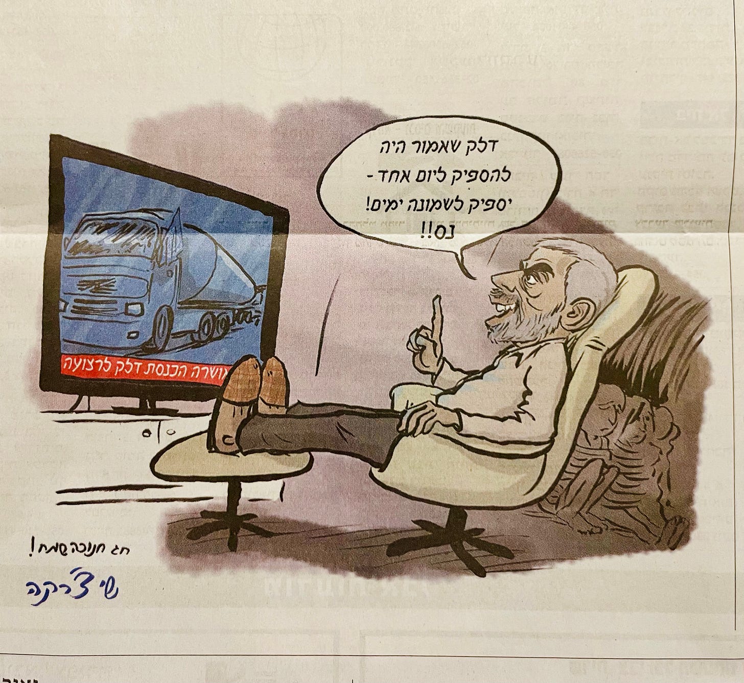 A Makor Rishon cartoon of Hamas head Yihyeh Sinwar watching Israeli TV (which he is known to do, as he speaks a perfectly fluent Hebrew) with pictures of humanitarian assistance trucks bringing fuel into Gaza. We’ll come back to that.