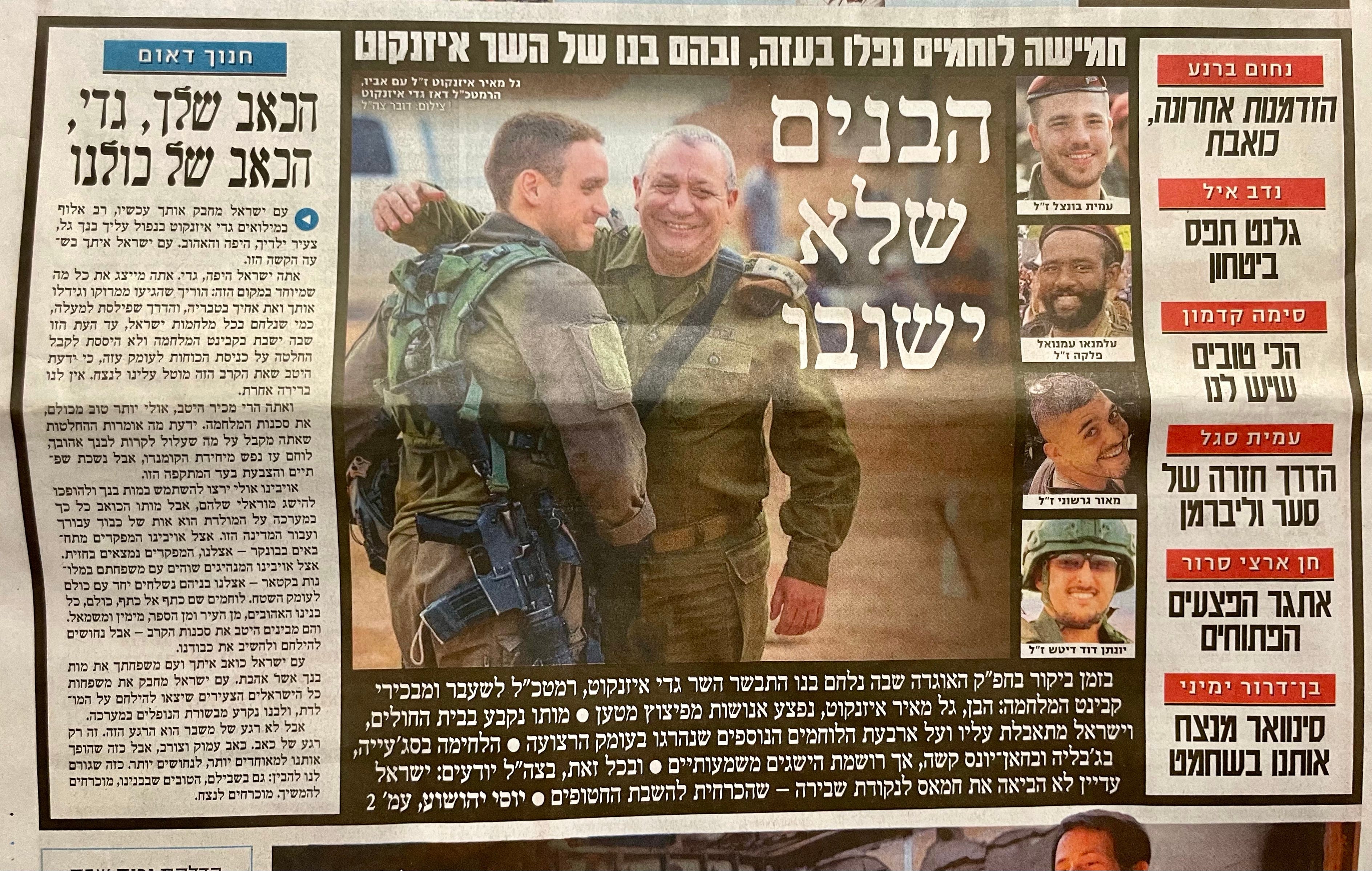 Immediately below, a portion of the front page of Yediot Ahronot, with a photograph showing former IDF Chief of Staff Gadi Eizenkot, now serving in the war cabinet which is running the war, with his youngest son, Gal. Gal was killed in combat a few days ago, and the column to the left of the photograph, by Chanoch Daum, is a “letter” to Eizenkot from the people of Israel.