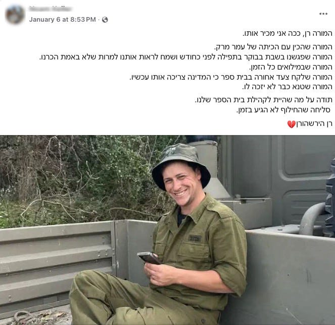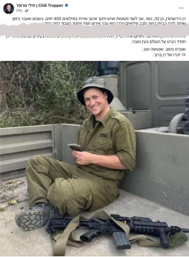 Chilli Tropper, an educator and currently a member of the Knesset for Benny Gantz’s National Unity Party, is an incredibly prolific, powerful and sensitive poster on Facebook. He posted this about Ran.