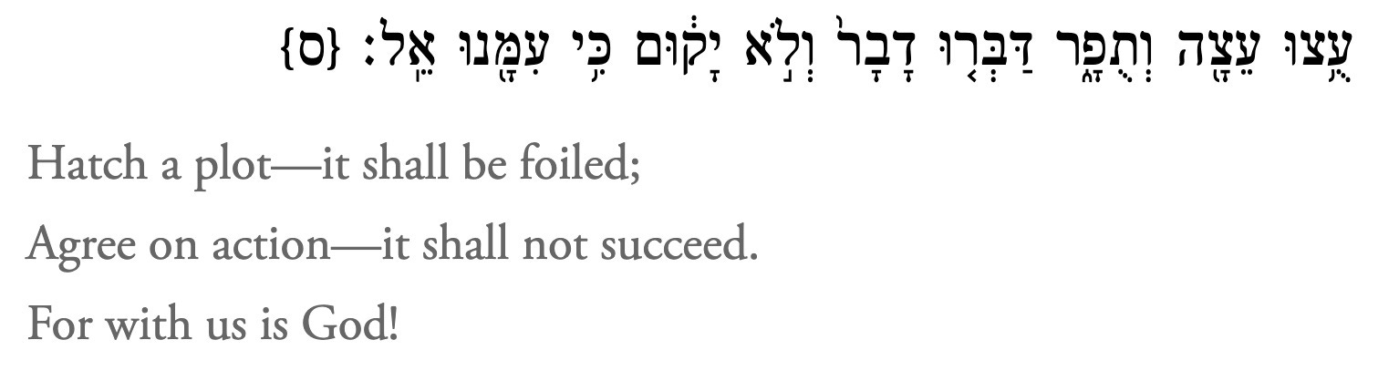 So what’s the irony? In Eastern Europe, the words (which made their way out of Isaiah and into the liturgy, and which in traditional prayerbooks are found immediately after the Aleinu prayer) were sung as a way of strengthening resolve when the Gentile authorities had issued some rule or proclamation designed to make life miserable for the Jewish community. What did these Jews assure themselves, quoting Isaiah? “You can hatch a plot against us, but it will be foiled, for God is with us.”