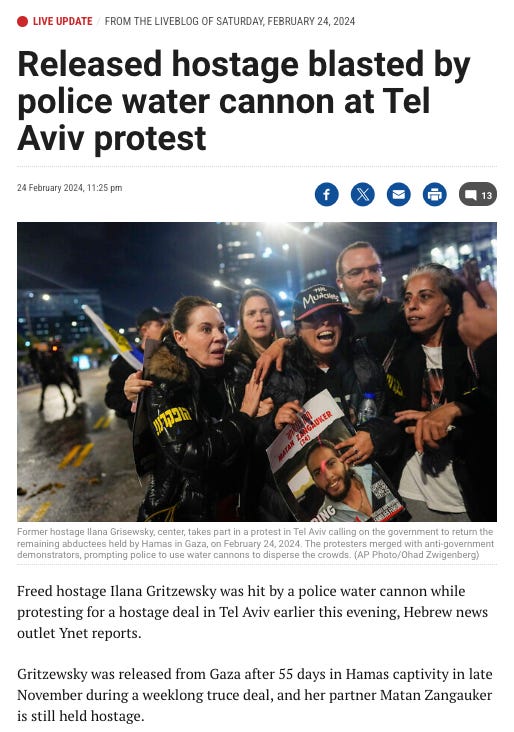 Turns out, as this article from Times of Israel, screenshot above, makes clear, the police were willing to water-cannon not only families of hostages, but former hostages themselves. The police, of course, are under the command of Itamar Ben-Gvir.