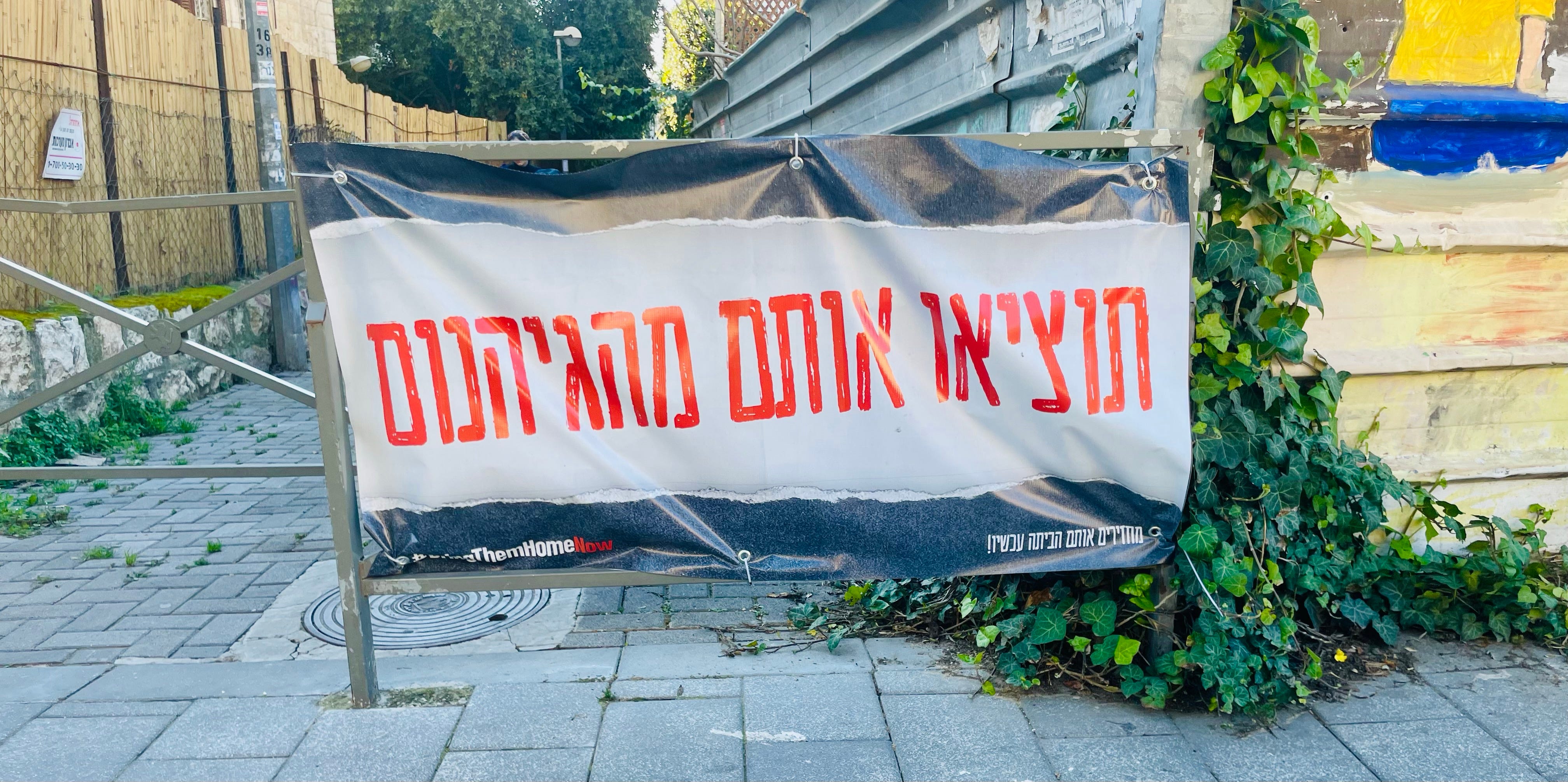 That’s why lots of the signs no longer say “Bring them home,” but rather, as on this sign that I saw walking home today, “Get them out of Hell.”