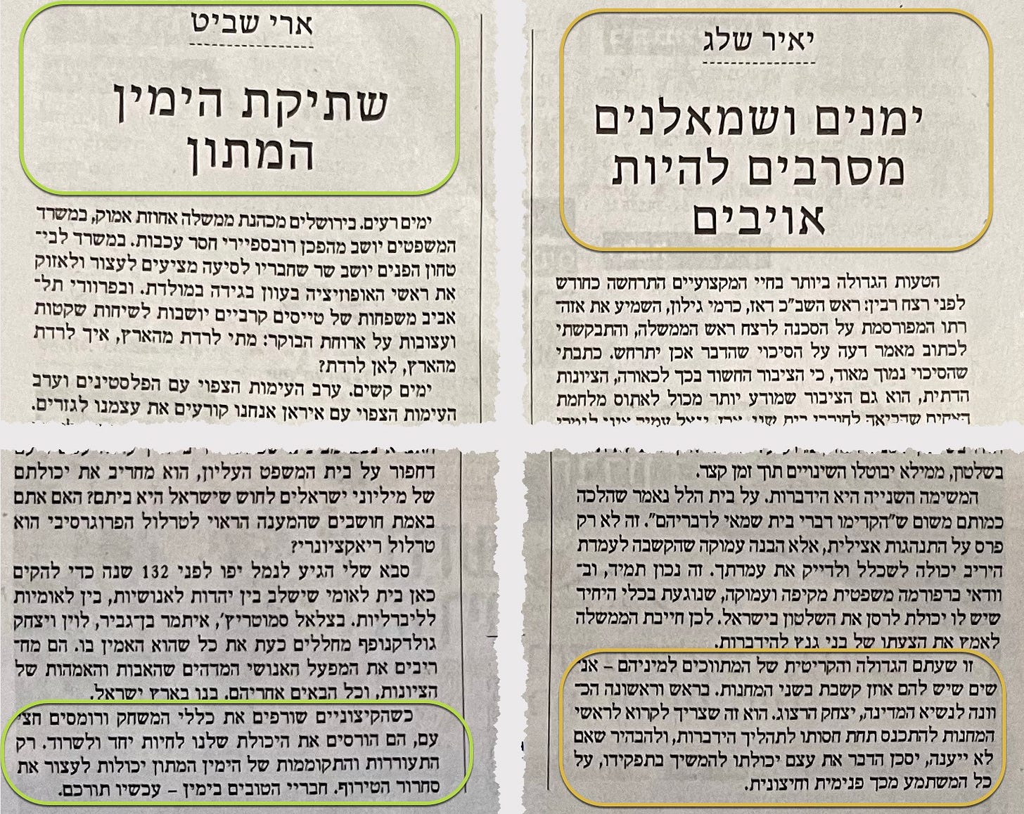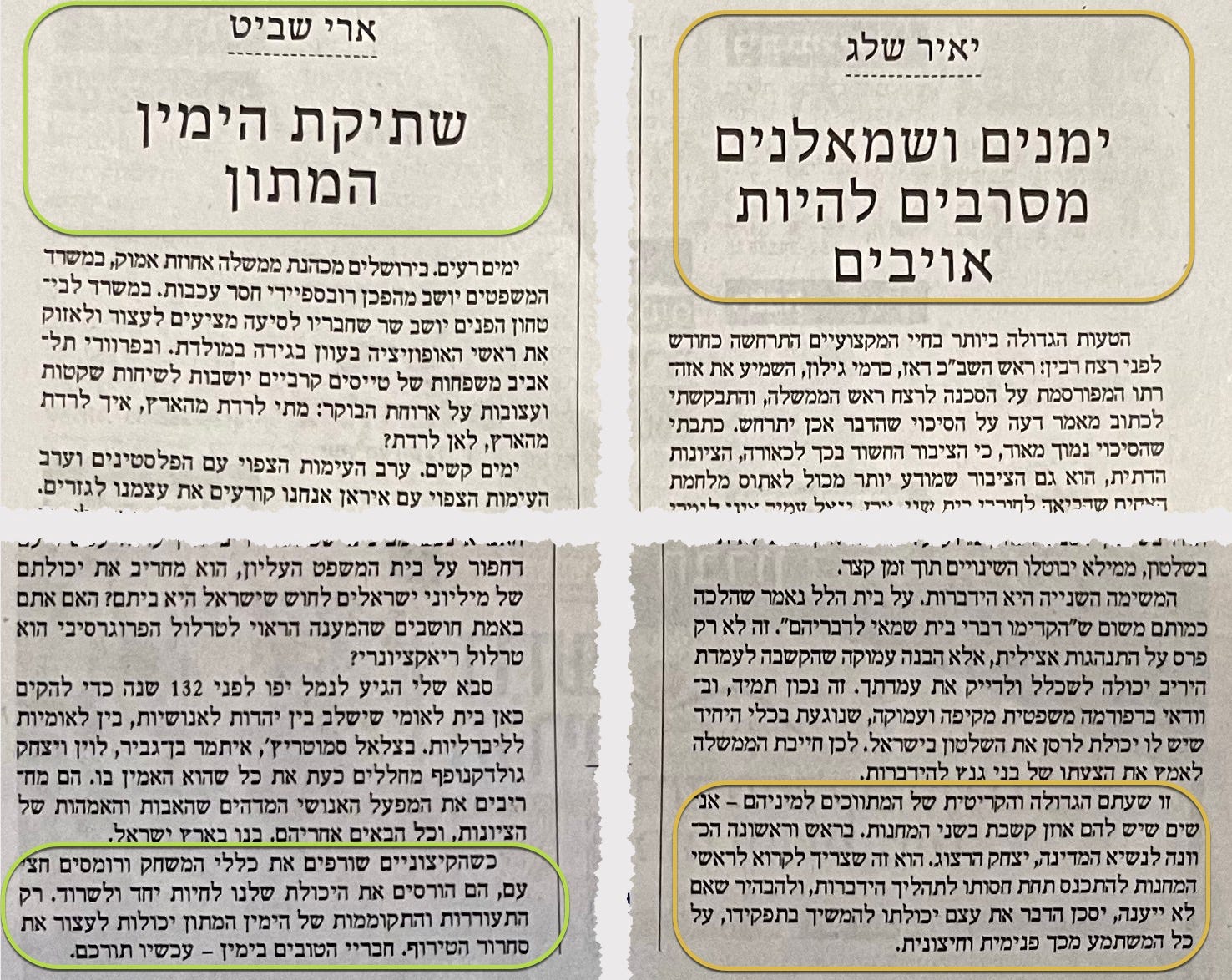 Ari Shavit’s column (green outlines on the left) is entitled “The Silence of the Moderate Right.” It begins: