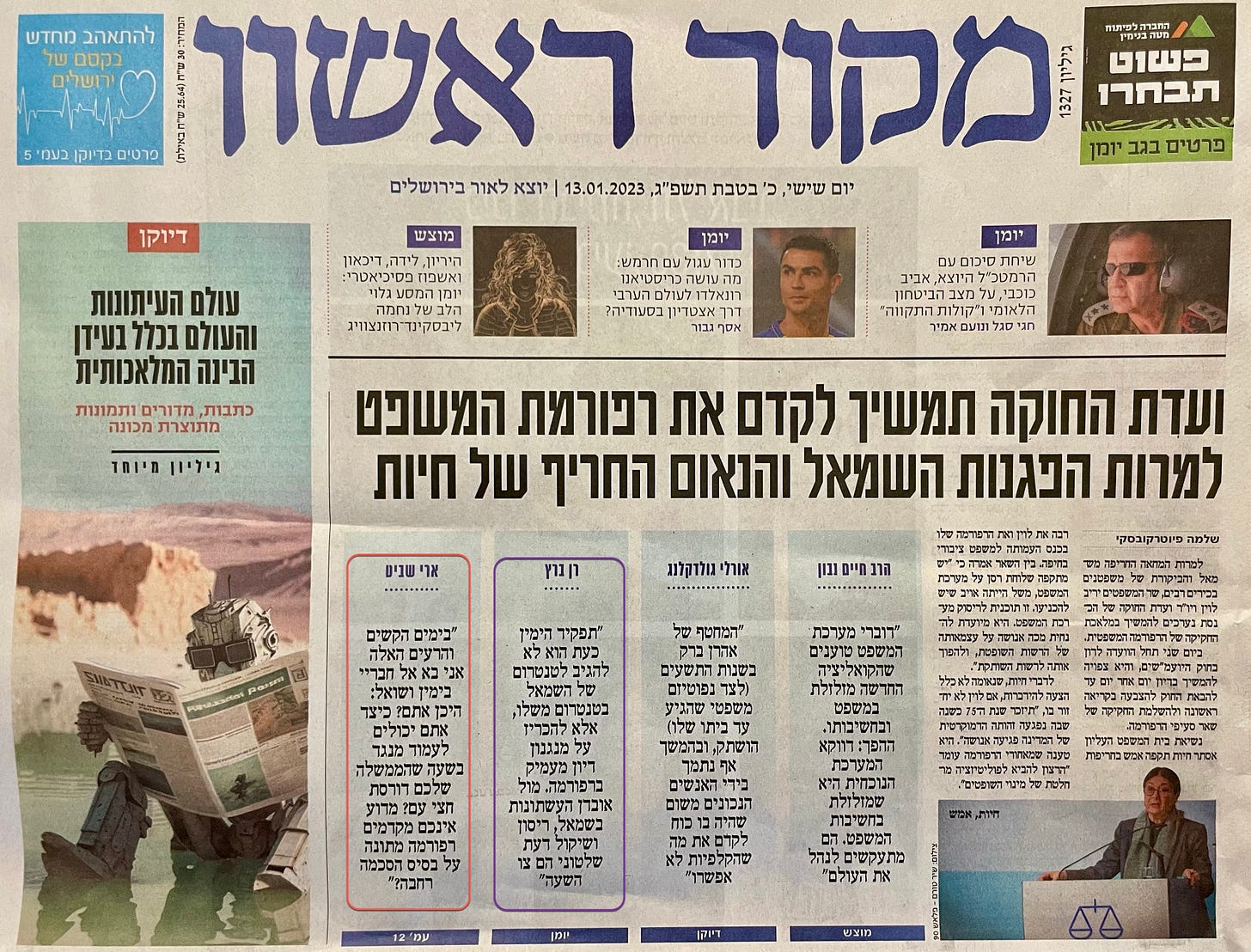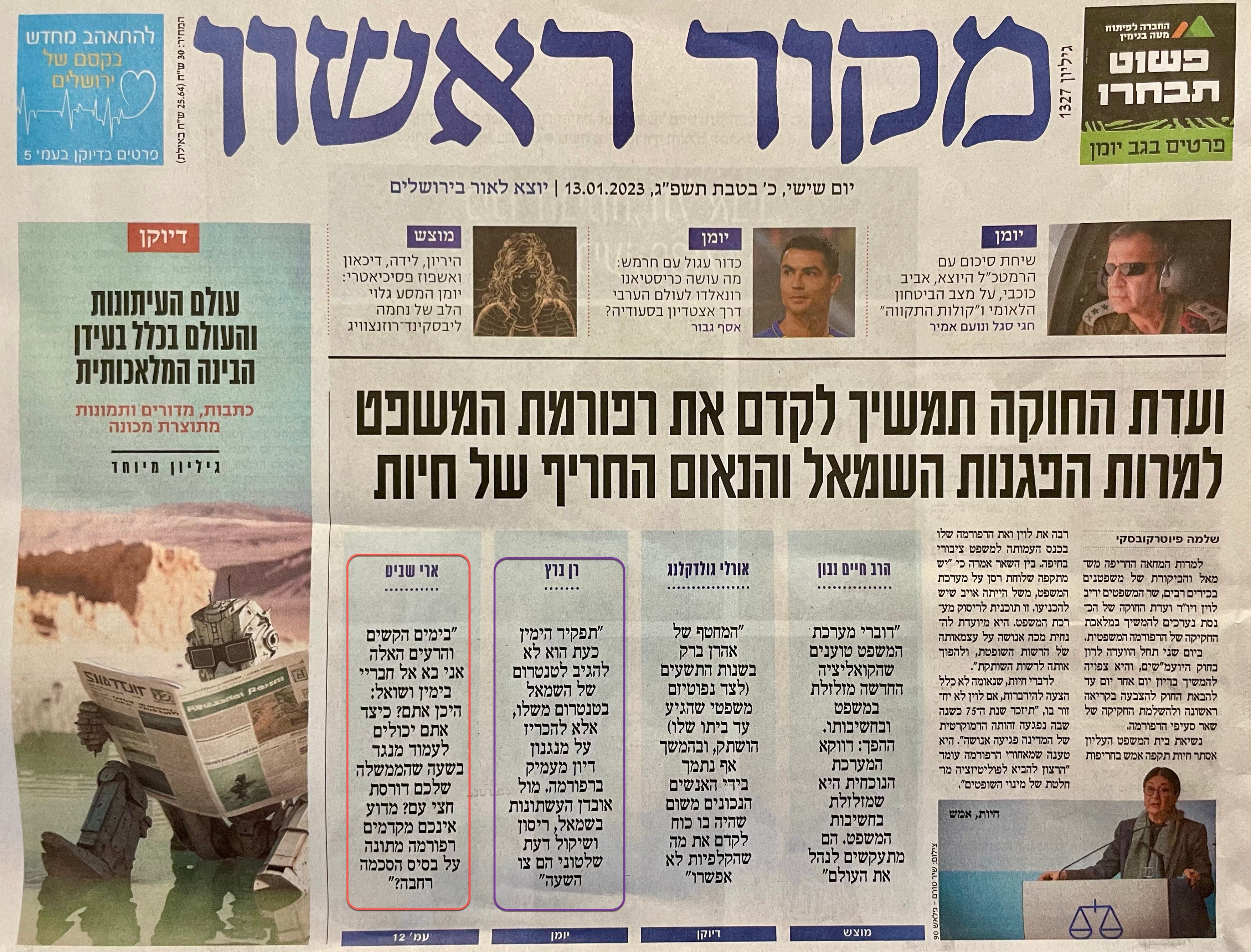 In the orange frame (which I added) on the bottom left is a column by Ari Shavit, to which we will return. In the purple (also not in the original paper), second from the left, is the above-mentioned column by Ran Baratz. Even though Baratz does call the reaction of the left to the proposed changes to the judicial system a “tantrum,” it’s worth noting how he ends his column: