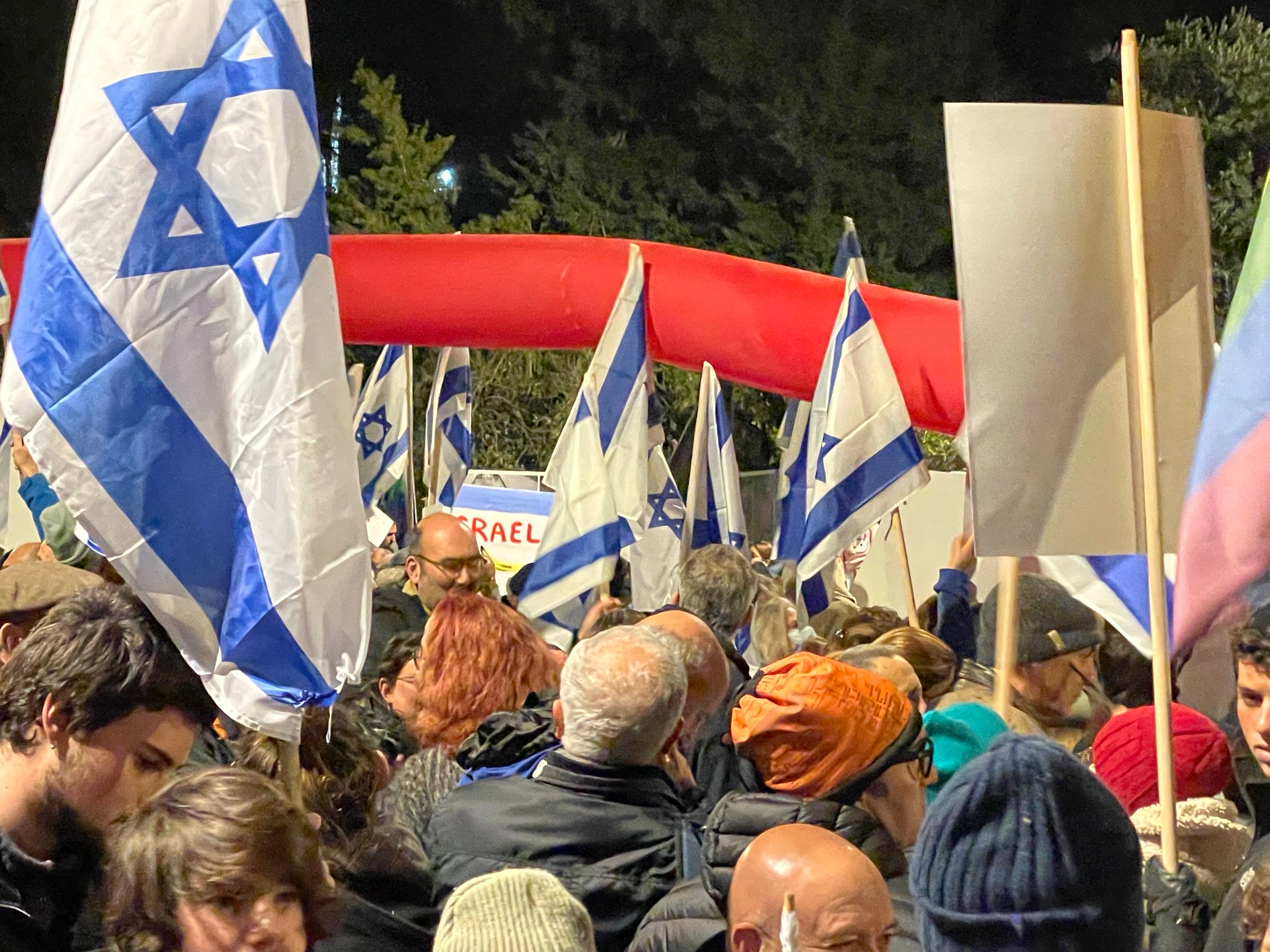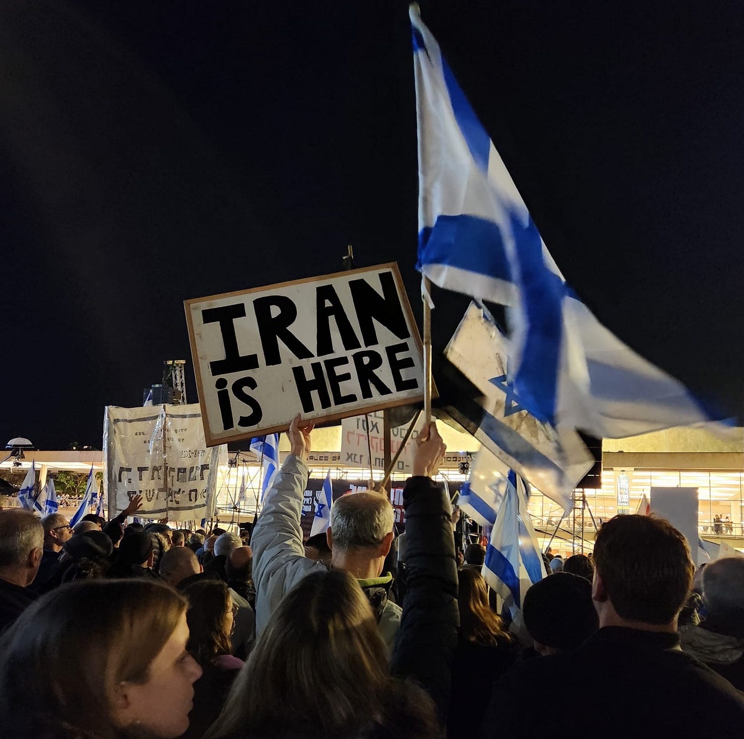 Rather than claiming that we’ve become Iran—which we have not, and which we are not about to—the protesters in Jerusalem, Haifa and Tel Aviv on Saturday night did something smart for once. They refused to cede the flag to the Right. The photo below is a small fraction of the hundreds of flags that were aloft at the protest we attended.