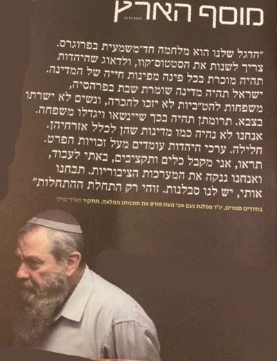 Very few of those get translated into English. Almost none, in fact. In Hebrew, thankfully, there are many to be read. Consider the front page of the above-mentioned Makor Rishon, a center-right (largely religious) Israeli paper, this weekend.