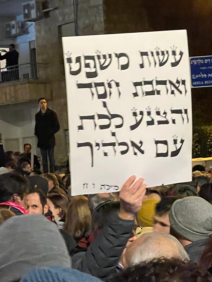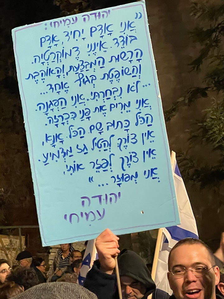 Much less unglued were the signs below, at the Jerusalem protest, which I attended. A poem (top right) by Yehudah Amichai, a quote from Micah 6:8—“Do justice, love mercy and walk humbly with God” (bottom left) and “there is no judgement, there is no judge,” a well known Talmudic aphorism (bottom right).