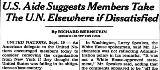 In September 1983, in response to a Soviet diplomat’s question about why the U.S. had to be the country in which the United Nations was situated, Charles M. Lichenstein, who was then serving as Deputy U.S. Ambassador to the United Nations, responded that he would be more than happy to see the UN leave America’s shores: “The members of the U.S. mission… will be down at dockside waving you a fond farewell as you sail into the sunset.”