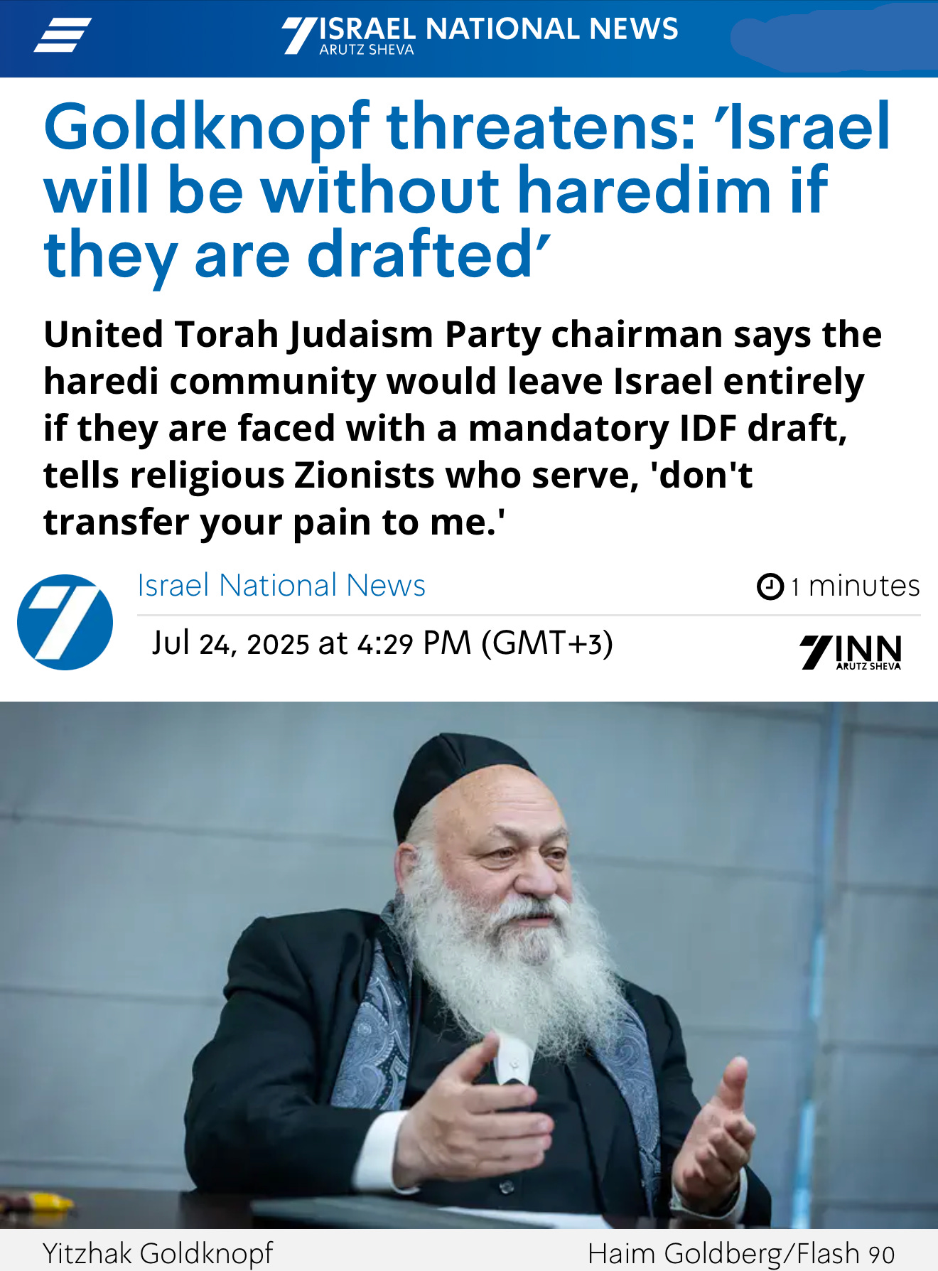 For the moment, at least, the Haredi issue is not much in the top headlines. For now, Israel is focused on the issue of the humanitarian crisis in Gaza, Israel’s military plans in Gaza (or lack thereof, if one believes Bezalel Smotrich, who may well be right about Bibi’s plans this time) and Israel’s increasing international isolation.