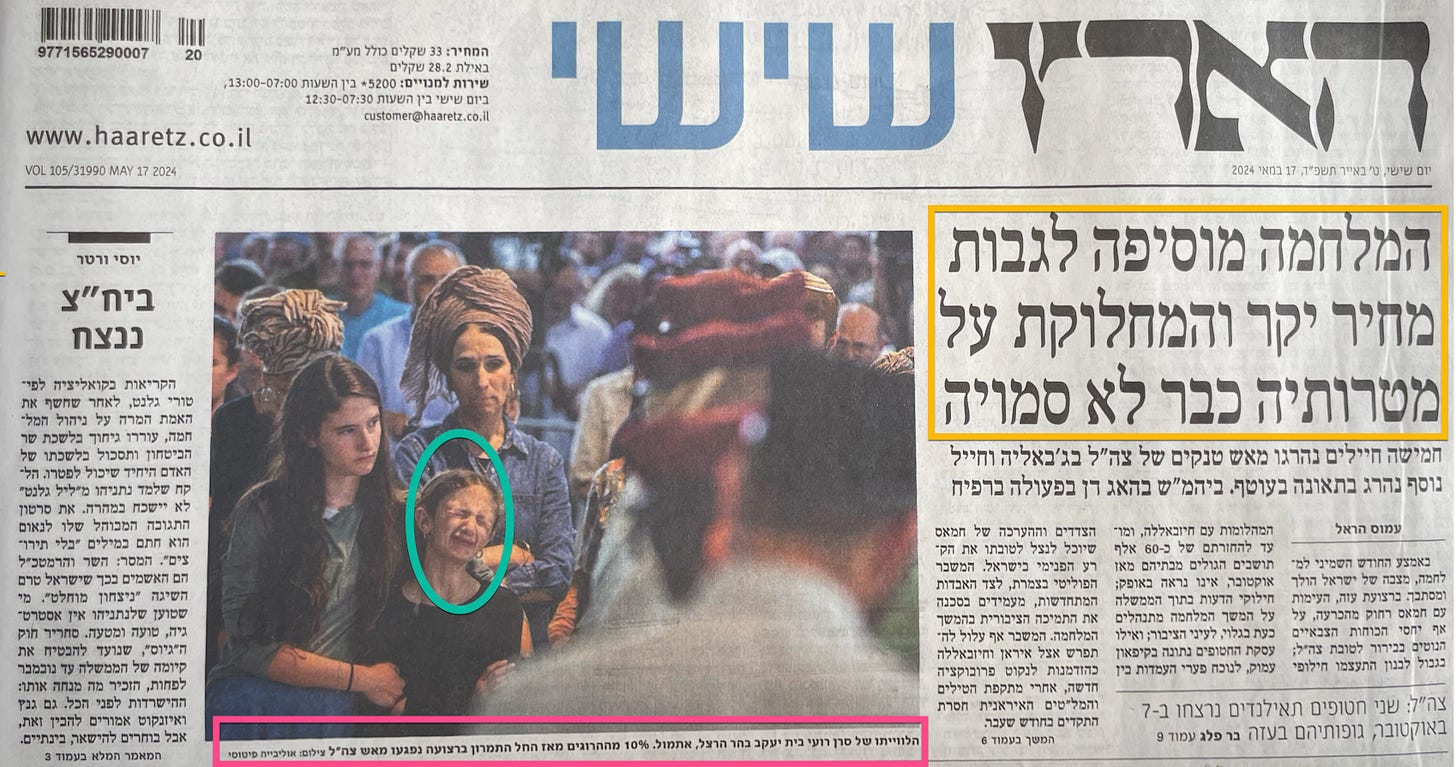 The RED caption for the photo reads: The funeral of Captain Ro’i Beit-Yaakov yesterday, on Mount Herzl. Since the beginning of the ground war, 10% of the casualties have been the result of friendly fire. [DG - Ro’i Beit-Yaakov was one of five soldiers killed when an Israeli tank misidentified them and fired on their position.]