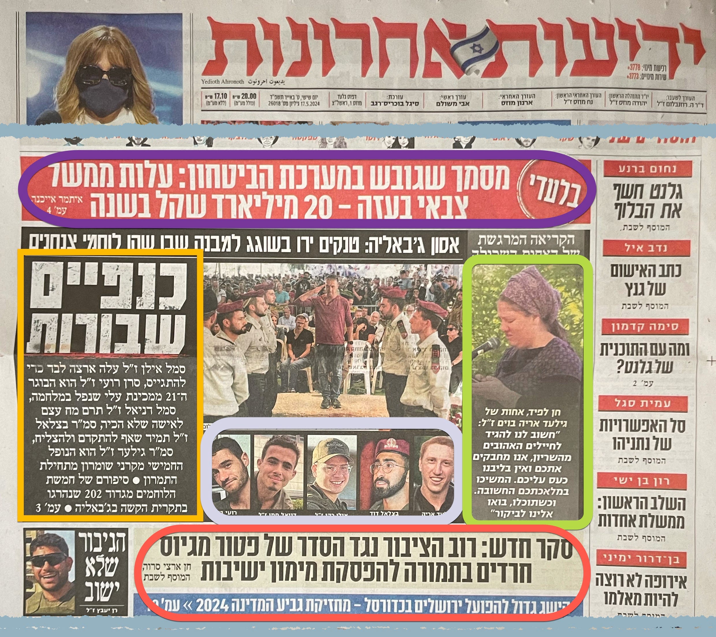 The amalgam of the stories says a great deal about where the soul of Israel is these days. What follows are three front pages, with quick notes on what each of the colored headlines is about.