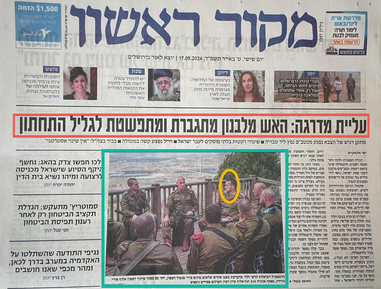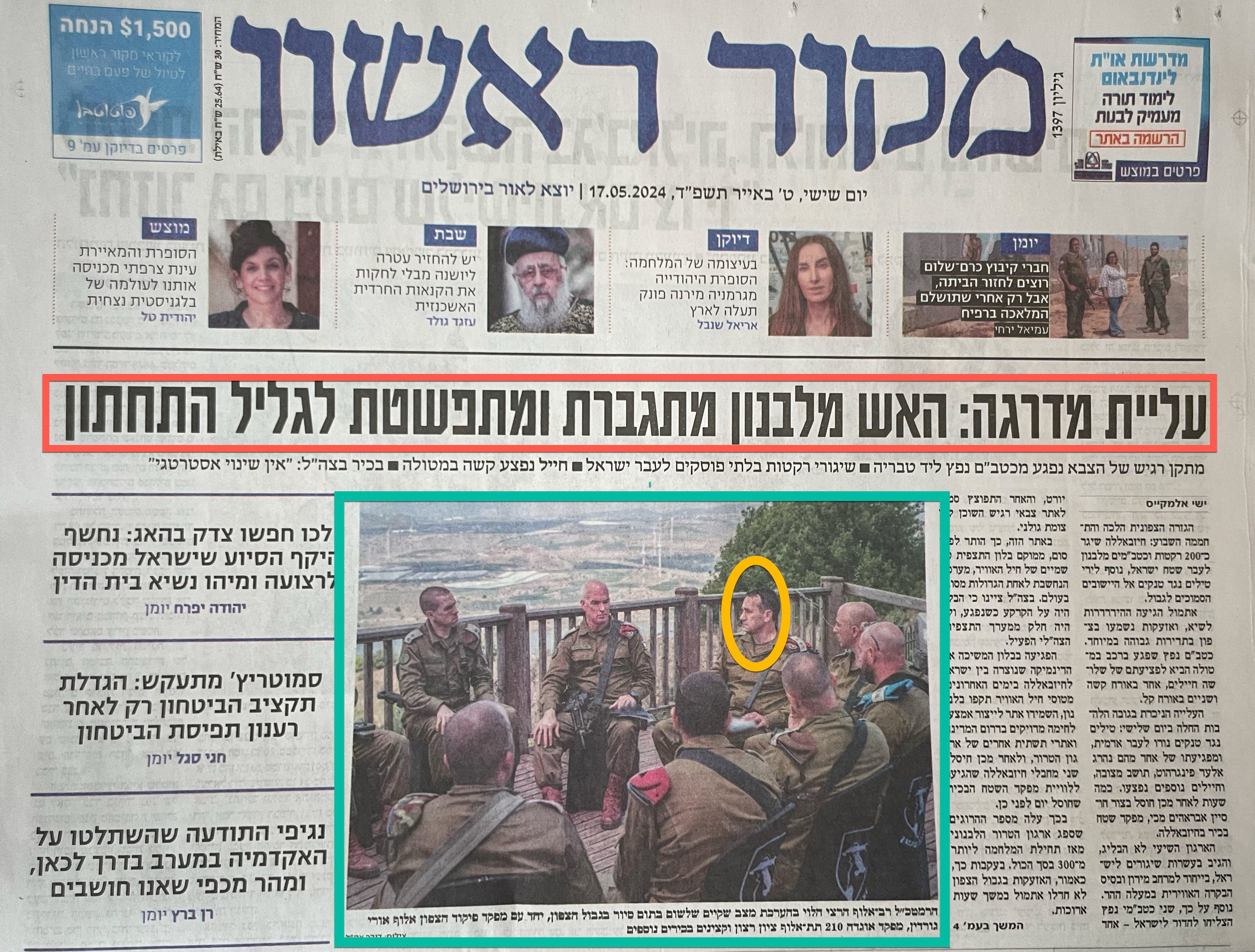 In the YELLOW circle is Chief of Staff Herzi HaLevi [DG - Halevi publicly assumed personal responsibility for the catastrophe on October 7 during the Memorial Day ceremony; his resignation is expected, though some are asking him to hold out to ensure that it is not Netanyahu who selects his replacement.]