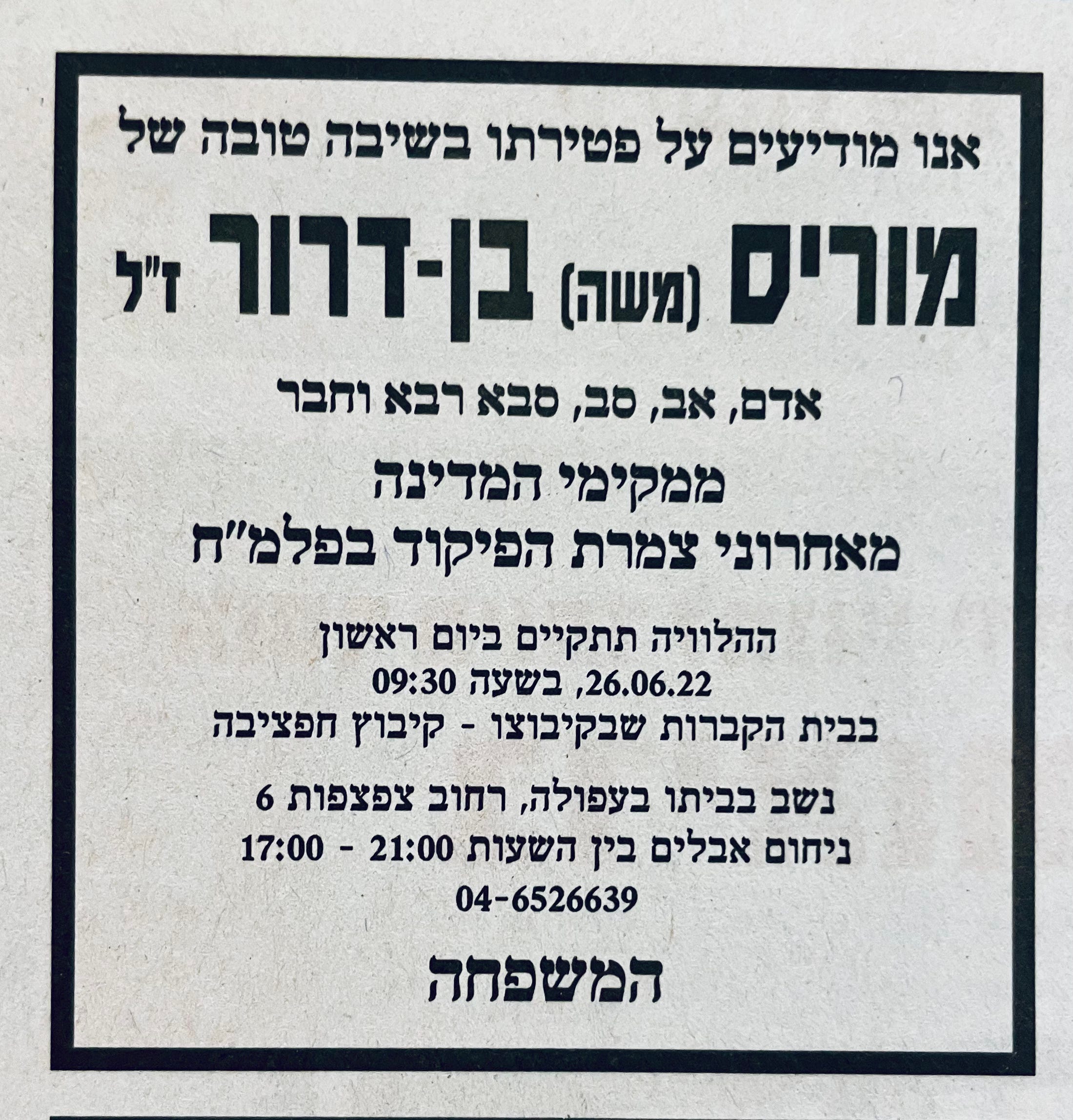 We got a phone call on Thursday night, telling us that Moshe Ben-Dror, a cousin whom we’d met only fifteen years ago but with whom we had become close, had died. He was less than a month shy of his 100th birthday.