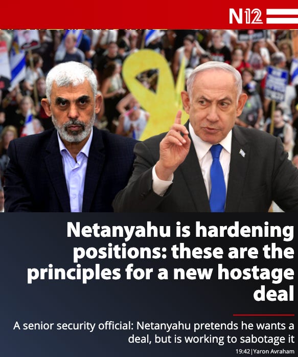 Yes, there’s still some talk of a deal, but most Israelis do not believe Sinwar and they do not believe Netanyahu. Just tonight, Sunday, the press was reporting once again, even as hundreds of thousands of Israelis had taken to the street to renew those old protests, that Bibi was torpedoing the possible hostage deal.