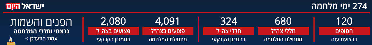 * 274 days of war * 120 hostages still being held in Gaza * 680 IDF personnel killed since the beginning of the war * 324 IDF personnel killed in battle since the ground operation began * 4091 IDF personnel wounded since the beginning of the war * 2080 IDF personnel wounded since the ground operation began
