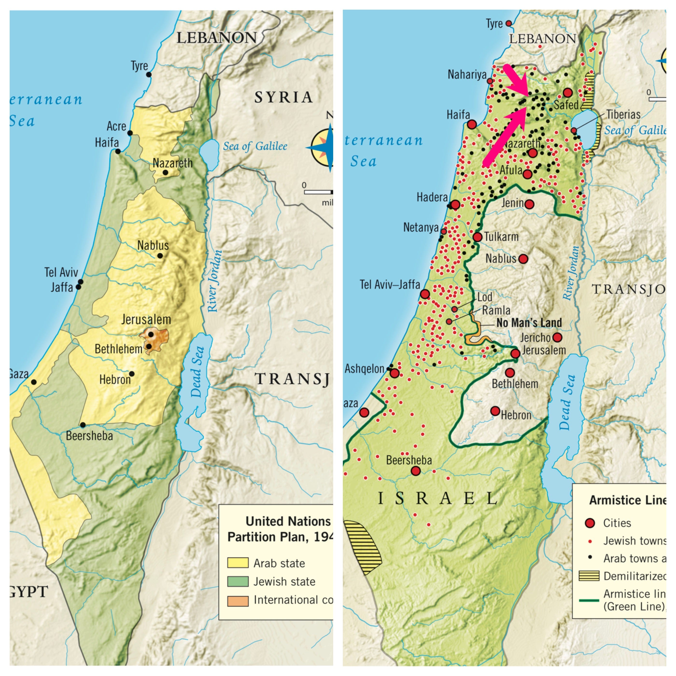 Why? Because that area of the Galilee was not included in the UN’s map for the Jewish state (voted on in November 1947), but rather, was captured in the War of Independence, and is now part of Israel’s heartland. [See pink arrows in the maps below.]