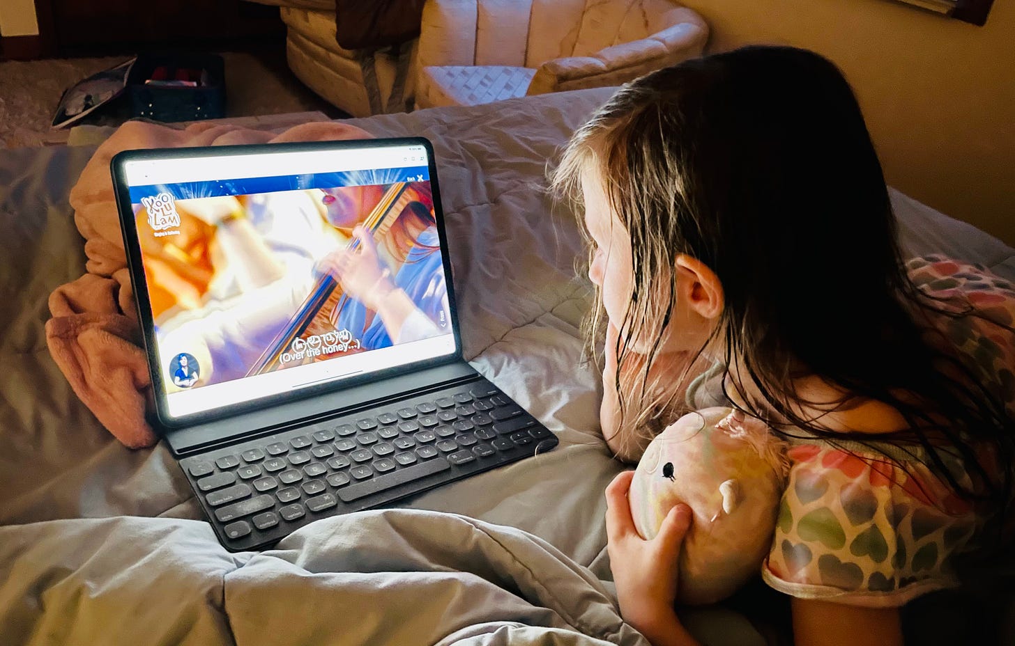 As for the photograph … A few months ago, my wife and I took our eldest granddaughter away for a few days. Putting her to bed, we decided to watch with her (and Fluffy, her stuffed animal) the video of the song we’d sung to her mother so many thousands of times. So out came the iPad, the video we saw above, and Naomi Shemer’s words.