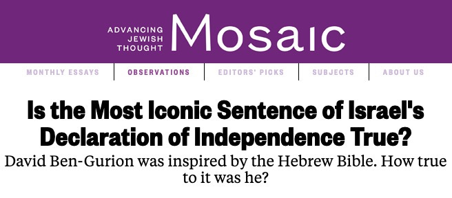 I have a very brief column in Mosaic Magazine this week that looks at two key sentences in Israel’s Declaration of Independence and shows that the accepted translations (including the “official” translation on the Knesset website) are essentially incorrect. How do we know what they really mean? It takes a bit of sleuthing with the Hebrew Bible, the book that Ben-Gurion knew so intimately.