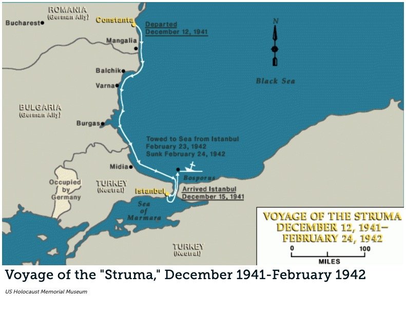 The story begins in 1941, by which point it was clear to many Eastern European Jews that they were destined for a horrific end. In Romania, several Zionist organizations, Betar (which had been headed by Menahem Begin, about whom we’ll write next week on the occasion of his 30th yahrzeit), among them, commissioned a Bulgarian ship—the Struma—to transport almost 800 Jewish passengers to Palestine. (We also mentioned the Struma in this column).