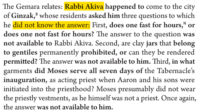 Rabbi Akiva, one of the greatest Jewish sages of all time, did not know the answer to the questions he was asked. When faced with the questions, though, he did not pretend that he knew. Nor is his not having known the answer presented as some sort of blemish. He was human, and he didn’t know everything. Plain and simple.