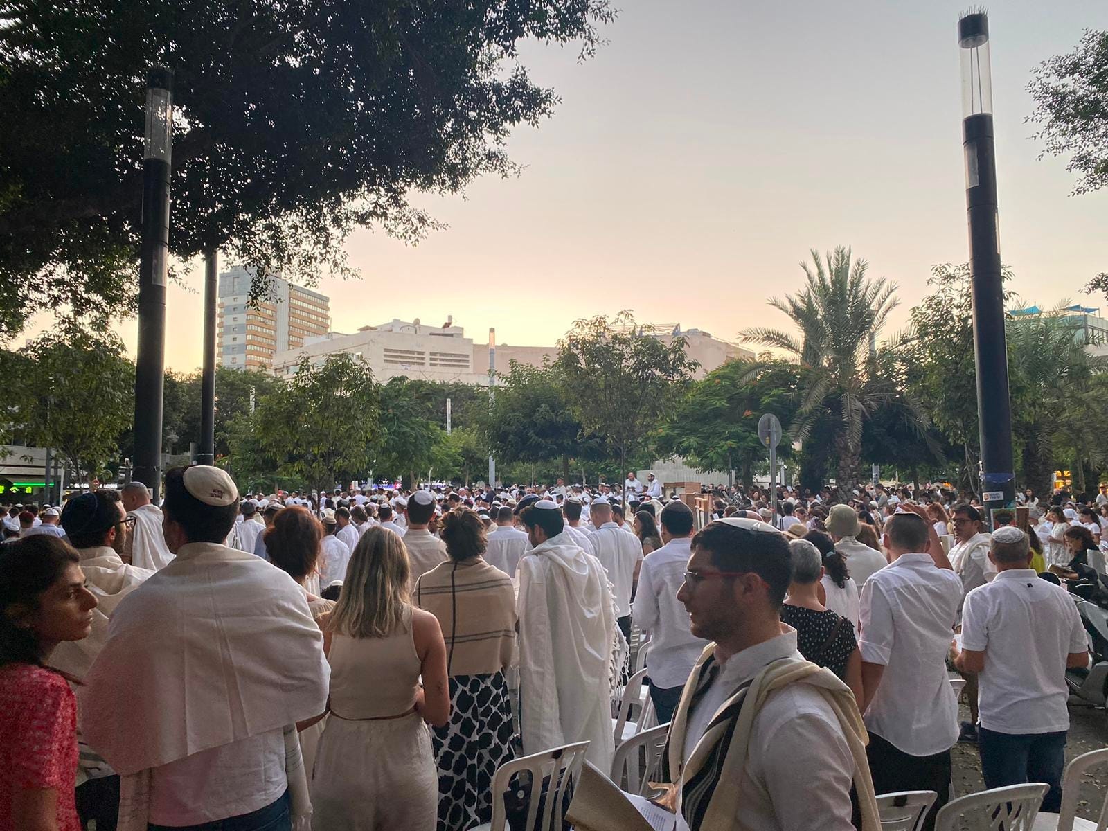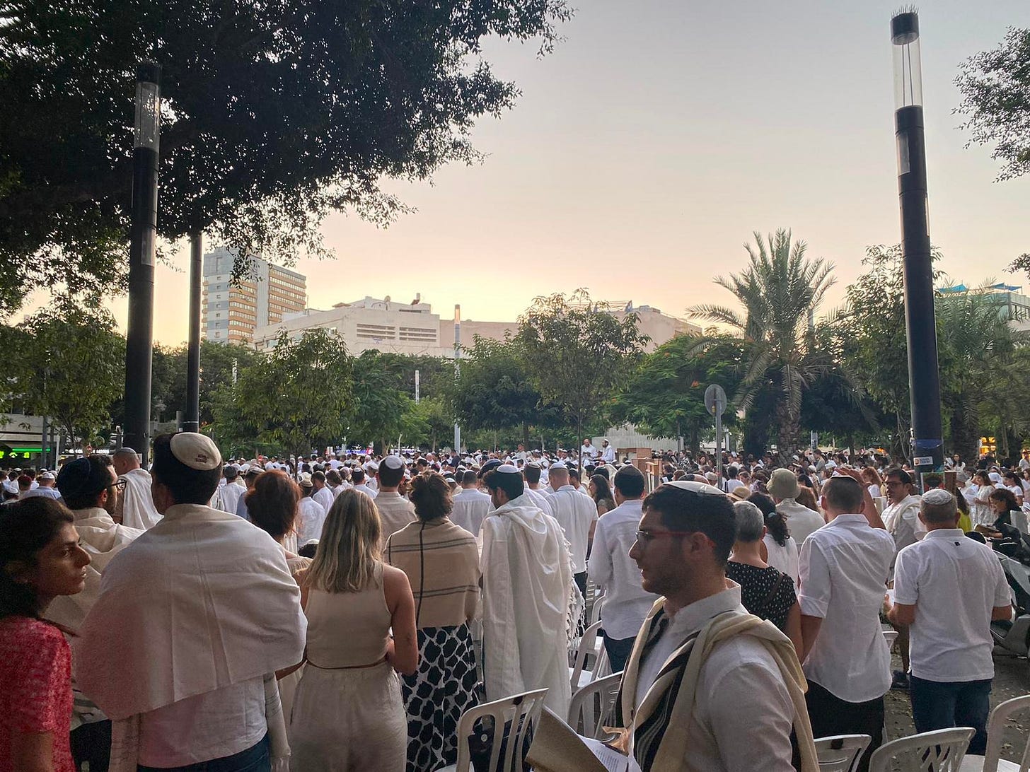 And that is the whole point. This rabbi and this congregation choose to be outside so that people who do not plan to spend all day at services, but who still want Yom Kippur to be part of their lives, can participate. Many Israelis do not feel comfortable going into a synagogue—but who can’t go to Dizengoff Square? This is a photograph of the Jewish people. Of a Jewish people in which no one is judging anyone else. In which no one minds what anyone else does. In which people simply make space for each other, so they can all be part of the most sacred day of the year.