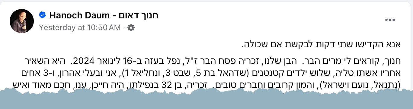 Hanoch, my name is Miriam Haber. Our son, the late Zachariah Pesach Haber, fell in Gaza on January 16, 2024. He left behind his wife Talia, three tiny children (Shadha’el, 5, Shevat 3, and Nahaliel 1), me and my husband Aaron, and 3 brothers (Natan’el, Noam and Israel), and a lot of relatives and good friends. Zachariah, 32 years old when he died, was a smiling, humble, very smart and an amazing family man.
