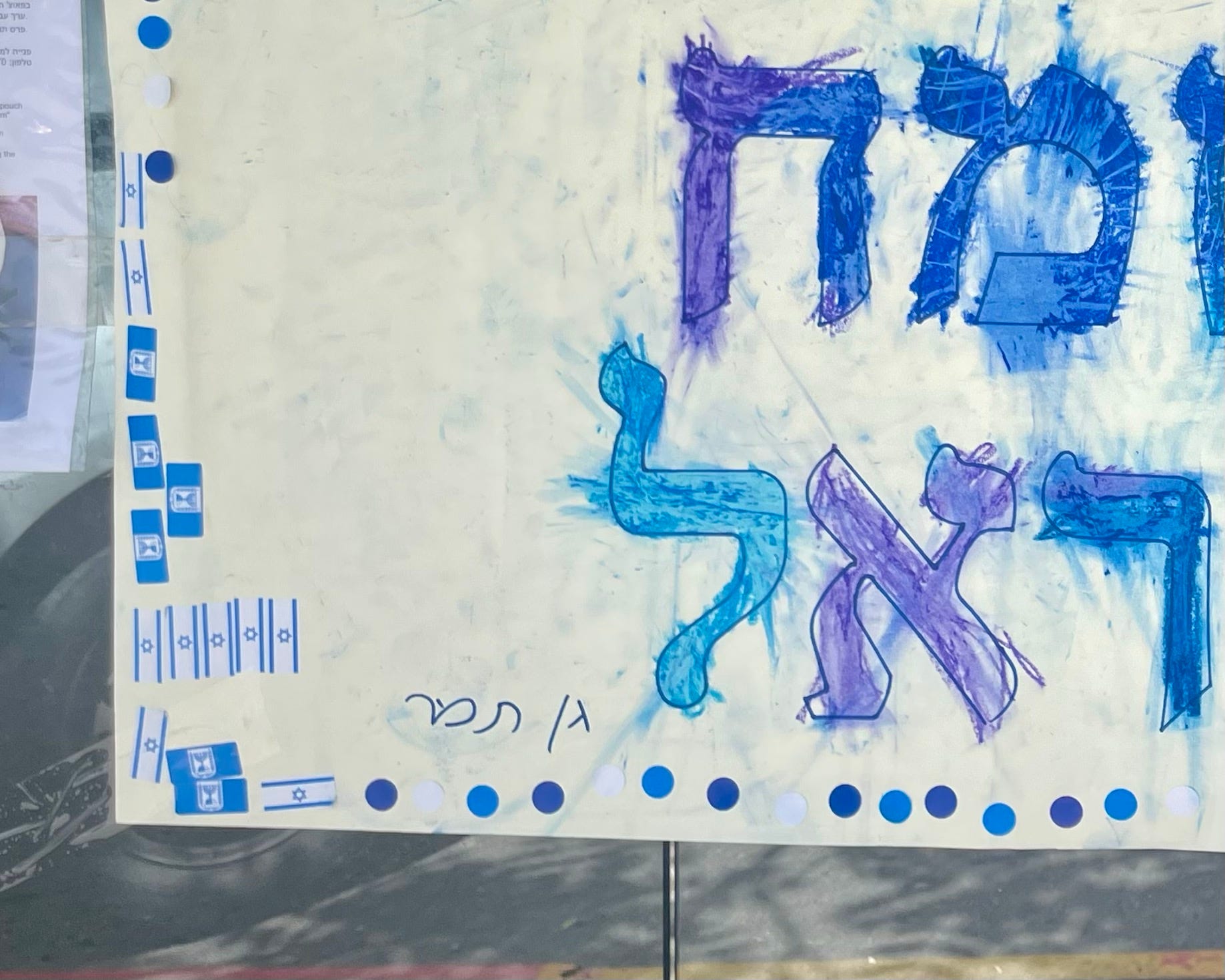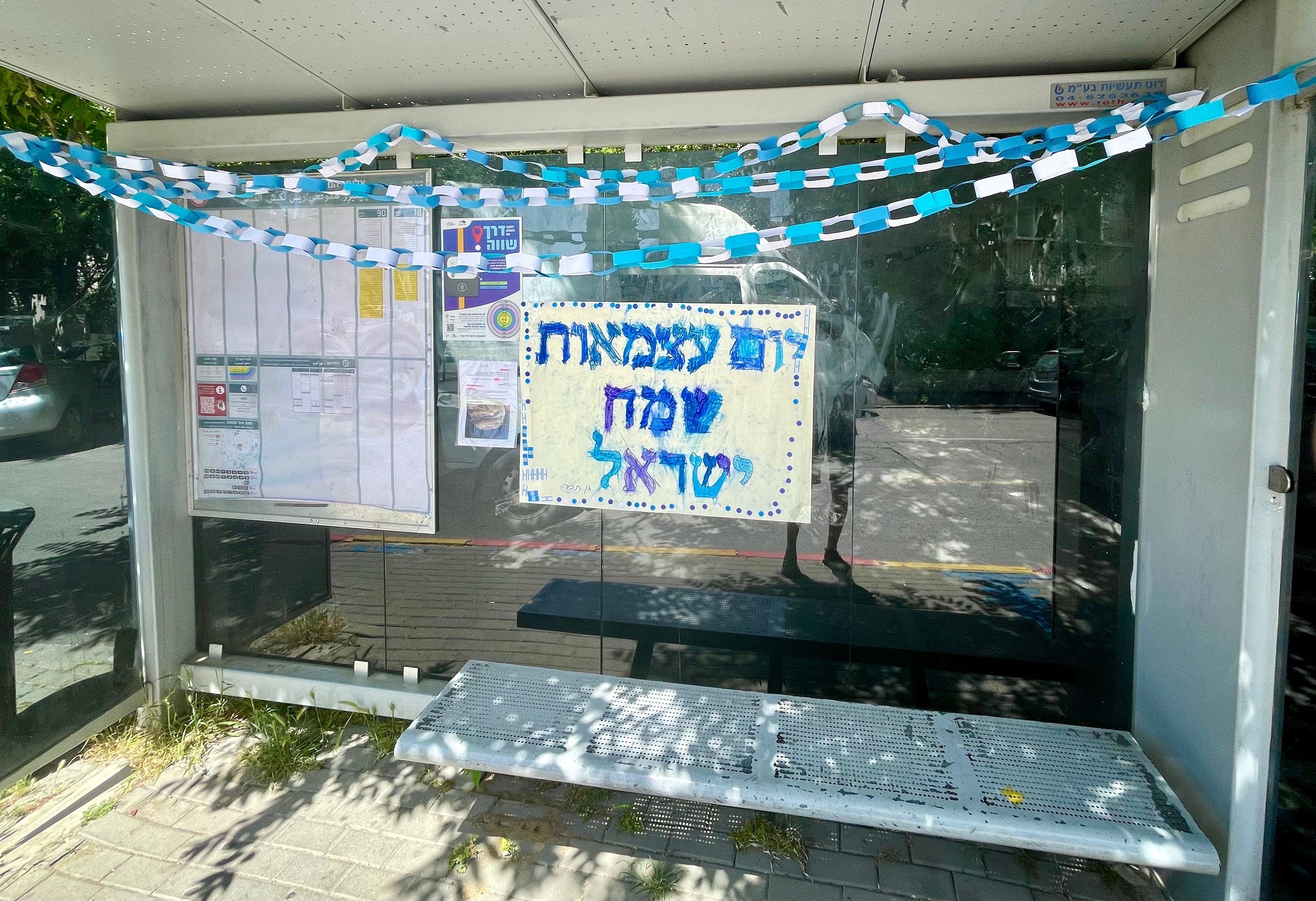I walked past this bus stop yesterday, and thought the blue and (purple and) white sign was adorable. יום העצמאות שמח ישראל, Yom Ha-Atzma’ut Same’ach, Yisrael. “Happy Independence Day, Israel.”