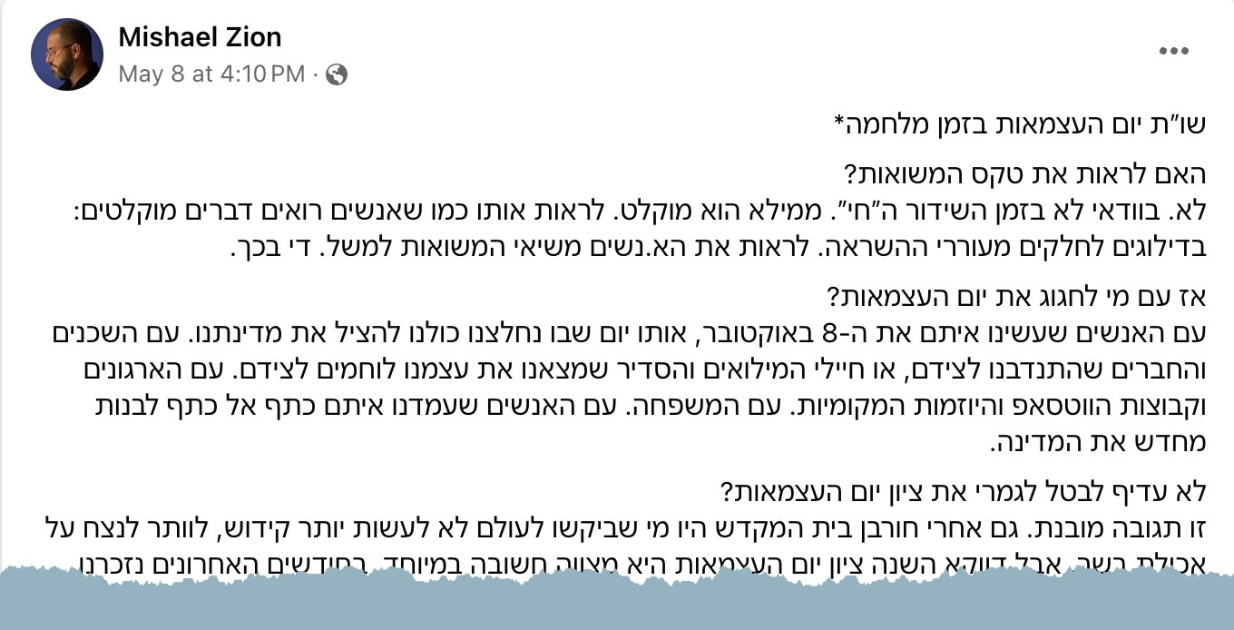 Different, but with similar devotion to and love for this country, is the following Facebook post which was posted by Hanoch Daum (again, Google translated with only the most major mistakes corrected);