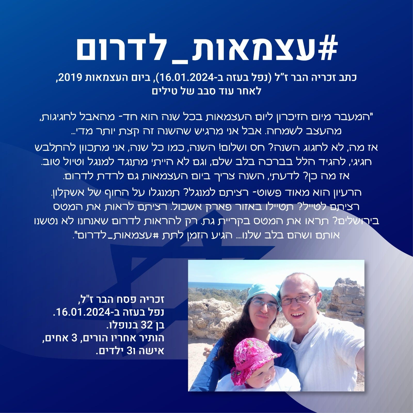 The idea is very simple—did you plan to have a barbecue on the beach in Tel Aviv? Have a barbecue [instead] on the beach of Ashkelon. Did you hope to travel in the area of Beit Shemesh, Nahal Alexander or the Dead Sea? Take a walk [instead] in the area of Eshkol Park, Nitsana or Hevel Lakish. Did you want to go out to a restaurant or a movie in Modi'in? Do it in Beer Sheva. Did you want to see the air force fly-over in Jerusalem? Watch the fly-over in Kiryat Gat... even a small part of the day (an hour or two) and come back, just to show the south that we have not abandoned them and the fact that they are not in the news on Independence Day does not mean that they are not in our hearts. It's true that most of us don't have time during the year to express our support for the south because of the busy week with work and children and family, etc., but this year we have the opportunity to take the day off that the vast majority of the country has and pour a little more meaning into it (without harming too much the fun and recreation itself)