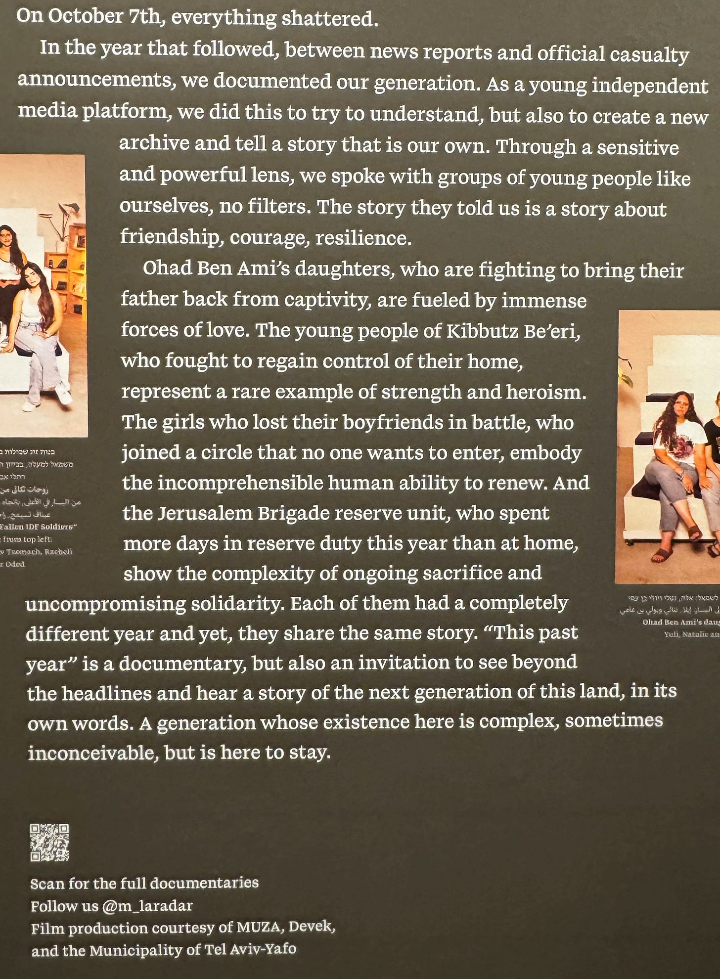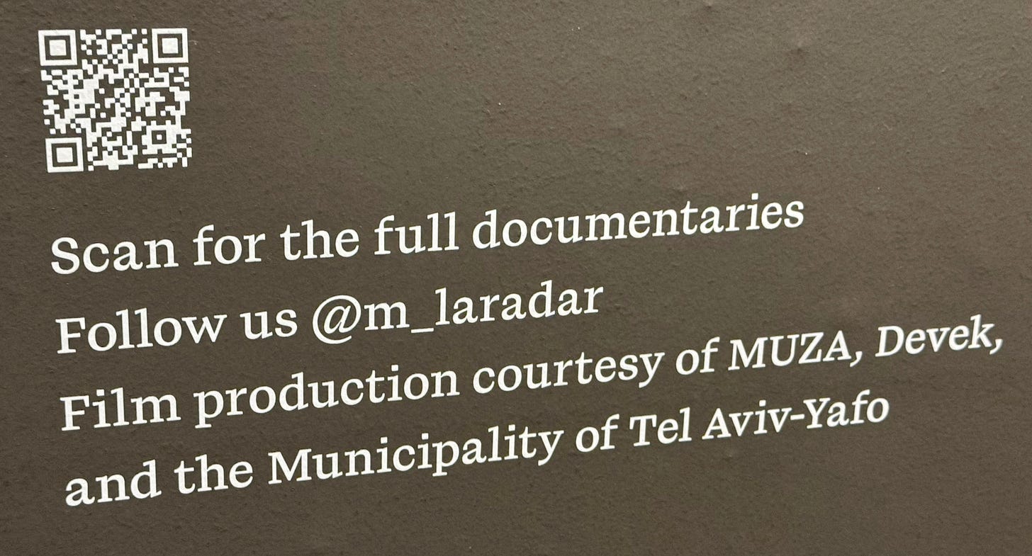 At the entrance to the “Local Testimony” Exhibit at Tel Aviv’s Land of Israel Museum which we posted about yesterday, there’s a huge QR code on the wall, inviting the visitor to watch a series of very brief documentary videos made about all the different groups listed above.