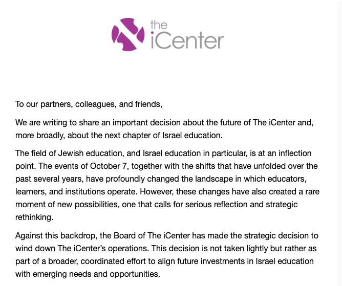 It should not surprise us (hark back to my niece’s program mentioned above) that the tsunani has also begun to hit the world of Jewish education, and Israel education specifically. The iCenter, long regarded as one of the pillars of American Judaism’s Israel education efforts, just announced that it’s shutting down.