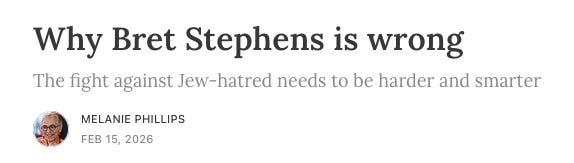 Not everyone, of course, agreed with Stephens; there was bound to be pushback to such a counter-establishment call. Jonathan Greenblatt wrote a very powerful reply, while Melanie Philips, whom we’ve also had on the podcast, responded on her Substack: